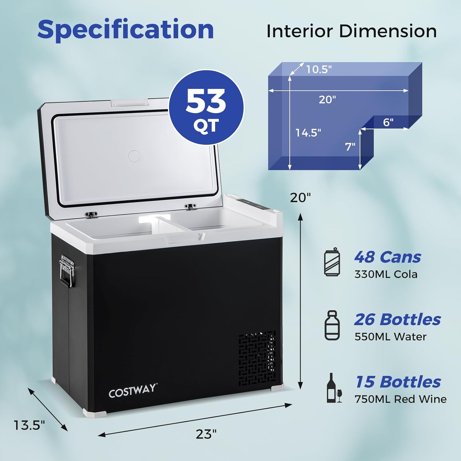 COSTWAY Portable Car Refrigerator, 53-Quart Dual-Zone Electric Cooler with Independent Temperature Control -4℉~68℉, 12/24V DC & 110-240V AC, ECO/MAX Mode, Car Fridge Freezer for Camping Travel, Black