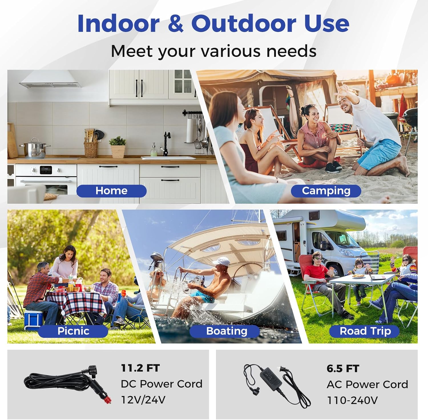 ️ [Silent for Car Use] With a noise level≦45dB, this portable electric cooler ensures an undisturbed resting environment. It can be connected to included 12/24V DC or 110-240V AC power cord for indoor and outdoor use, such as camping, picnic, boating, road trip and more.