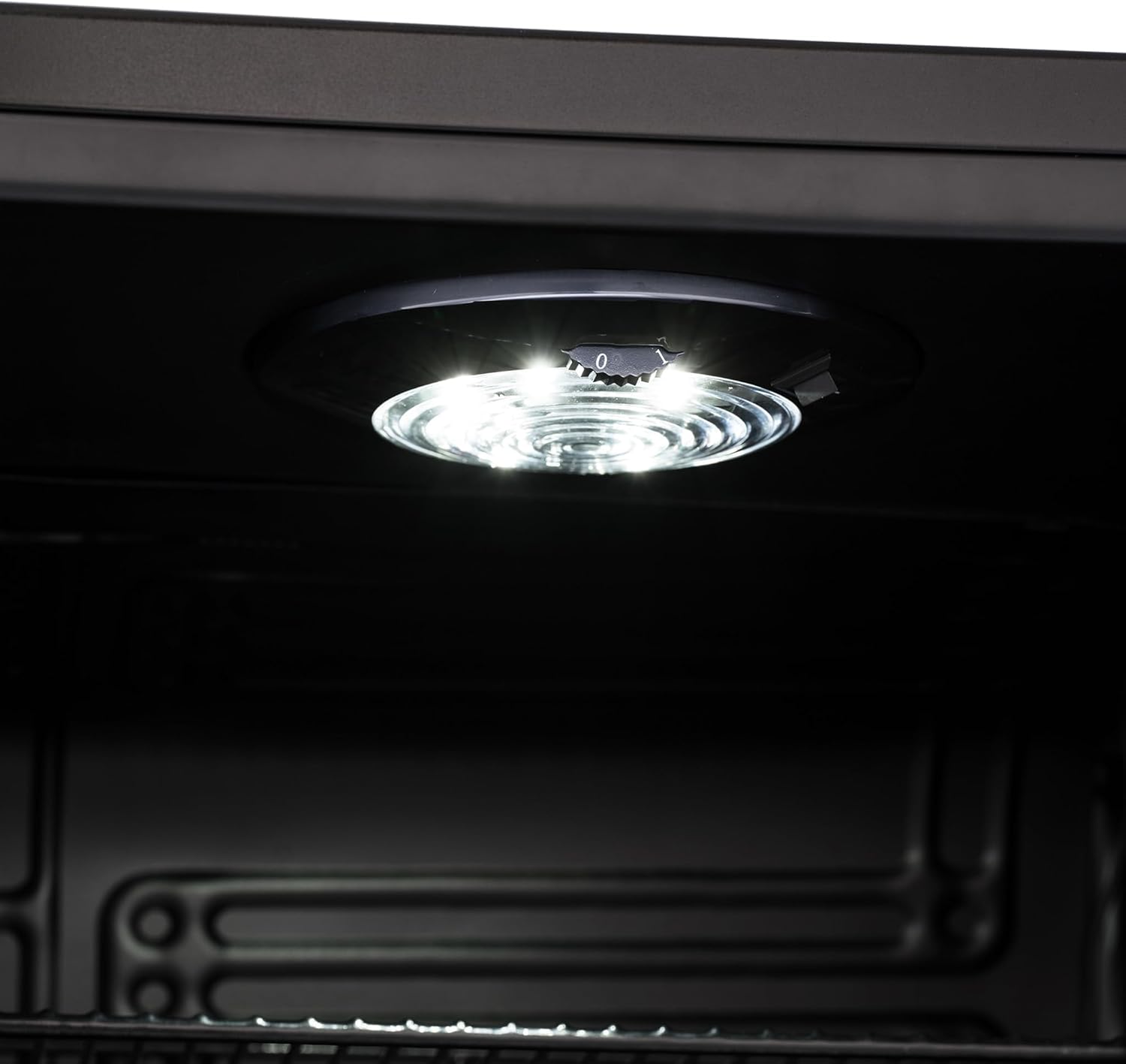 [SLEEK & STYLISH] – Onyx black with black adjustable wire shelves to accommodate a variety of sizes and a white LED interior lamp to guide you if it’s dark.
