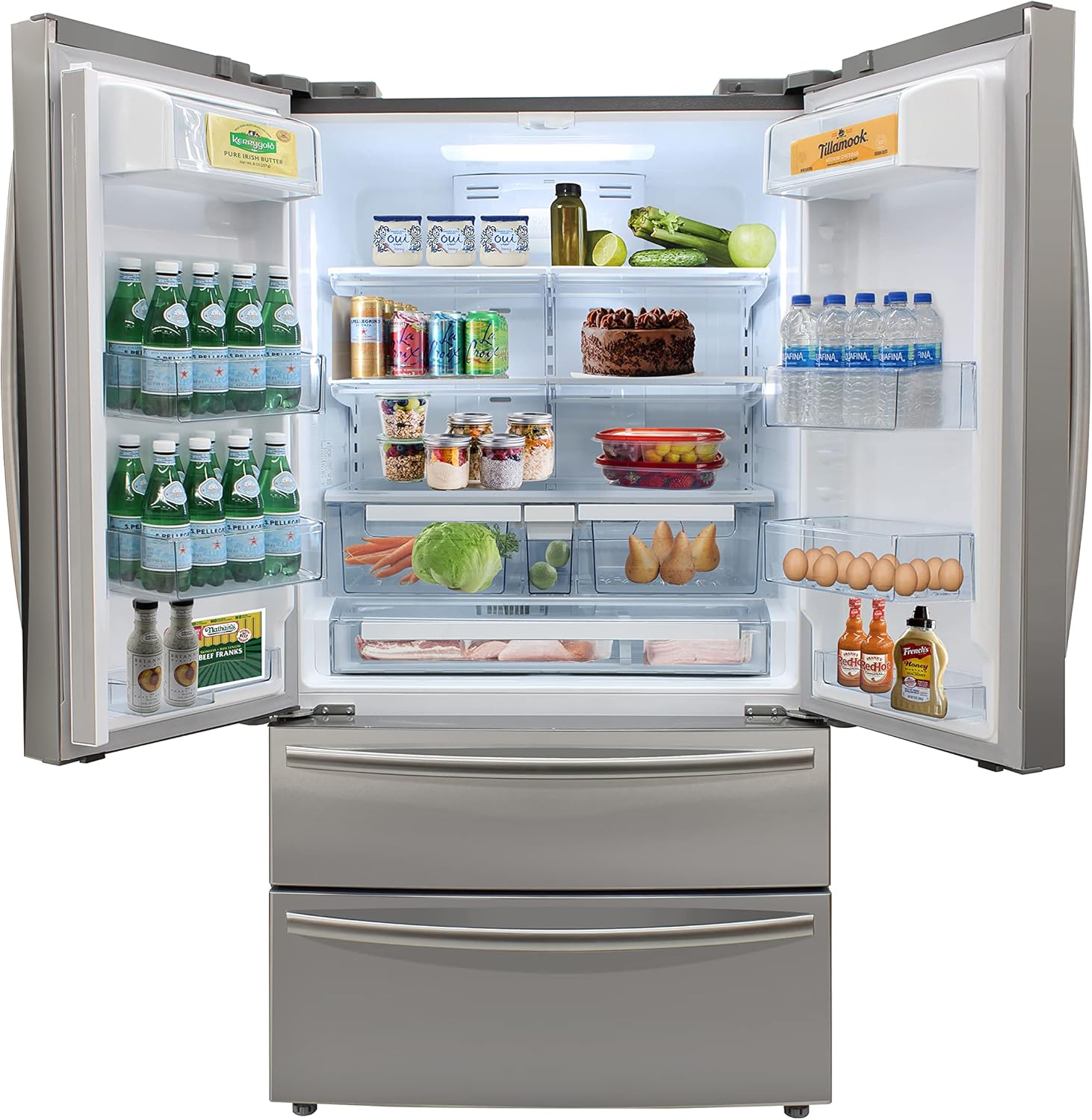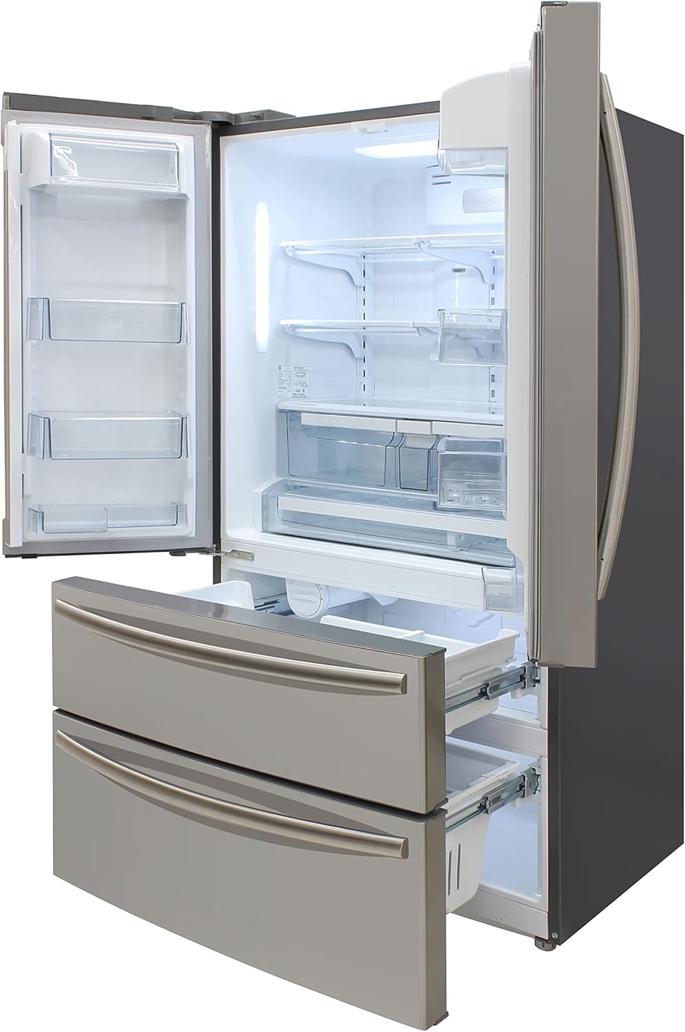With a spacious 20.7 Cu.Ft. capacity, the BRAMA French Door Refrigerator with Ice Maker and Dual Drawer Bottom Freezer provides ample storage space for your fresh and frozen foods and beverages. The adjustable shelves, humidity-controlled crispers, and adjustable gallon door bins allow for easy customization and organization. Experience precise temperature control with the electronic temperature feature, ensuring your items are stored under optimal conditions. The interior is illuminated with white LED lighting, making it effortless to locate and organize your food and beverages. The versatile dual-drawer freezer, located at the bottom of the refrigerator, offers easy access and efficient organization for your frozen food essentials. The built-in ice maker produces up to 7 lbs. of ice per day, complete with a convenient scoop and removable storage bin. Installation is convenient with the front exhaust design, allowing for freestanding placement or counter level built-in installation. The sleek stainless steel exterior adds a touch of elegance to your kitchen. Upgrade your kitchen with the BRAMA French Door Refrigerator with Ice Maker and Dual Drawer Bottom Freezer. Its large capacity, adjustable shelves, and precise temperature control make it an ideal addition for your kitchen, providing ample storage space and easy organization for all your food and beverage needs.