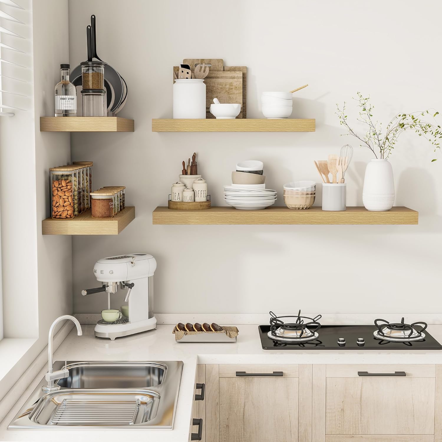 Well-designed Floating Shelves – The rustic style floating shelves combining both practicality and style. These shelves offer a 12″ generous deeper and thicker surface, perfect for organizing daily sundries without taking up valuable floor space.