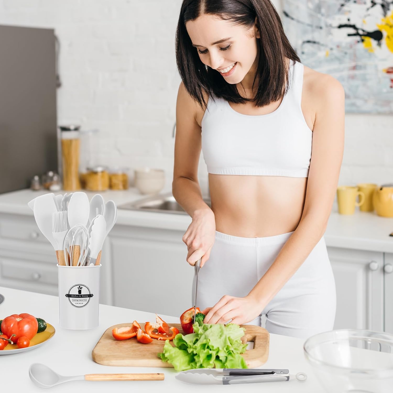 This silicone utensil set is the complete solution you’ve been searching for. The 12-piece collection includes every essential tool: soup ladle, spatula turner, slotted turner, large spatula, pasta server, slotted spoon, solid spoon, round spatula, kitchen tongs, and an egg whisk. This wood cooking utensils set arrives with a free countertop storage bin, helping you keep your kitchen tools and gadgets organized and within easy reach. It’s the perfect, ready-to-gift kitchen sets for newlyweds, new homeowners, or any cooking enthusiast looking to upgrade their home & kitchen essentials.