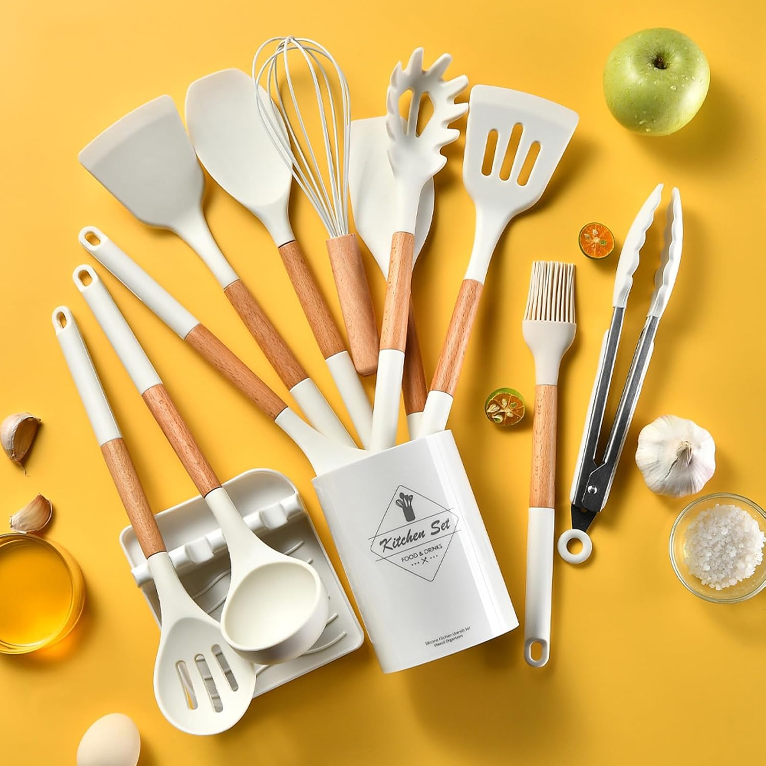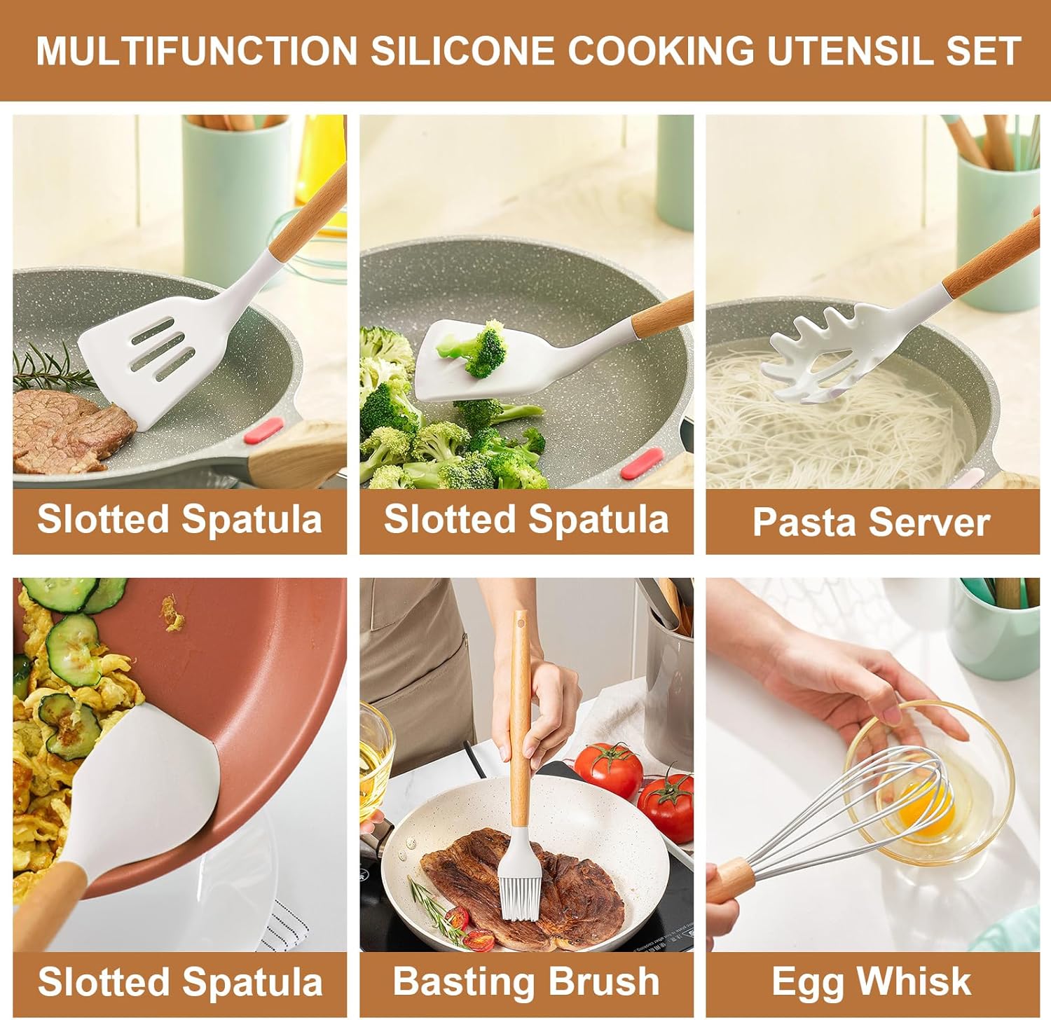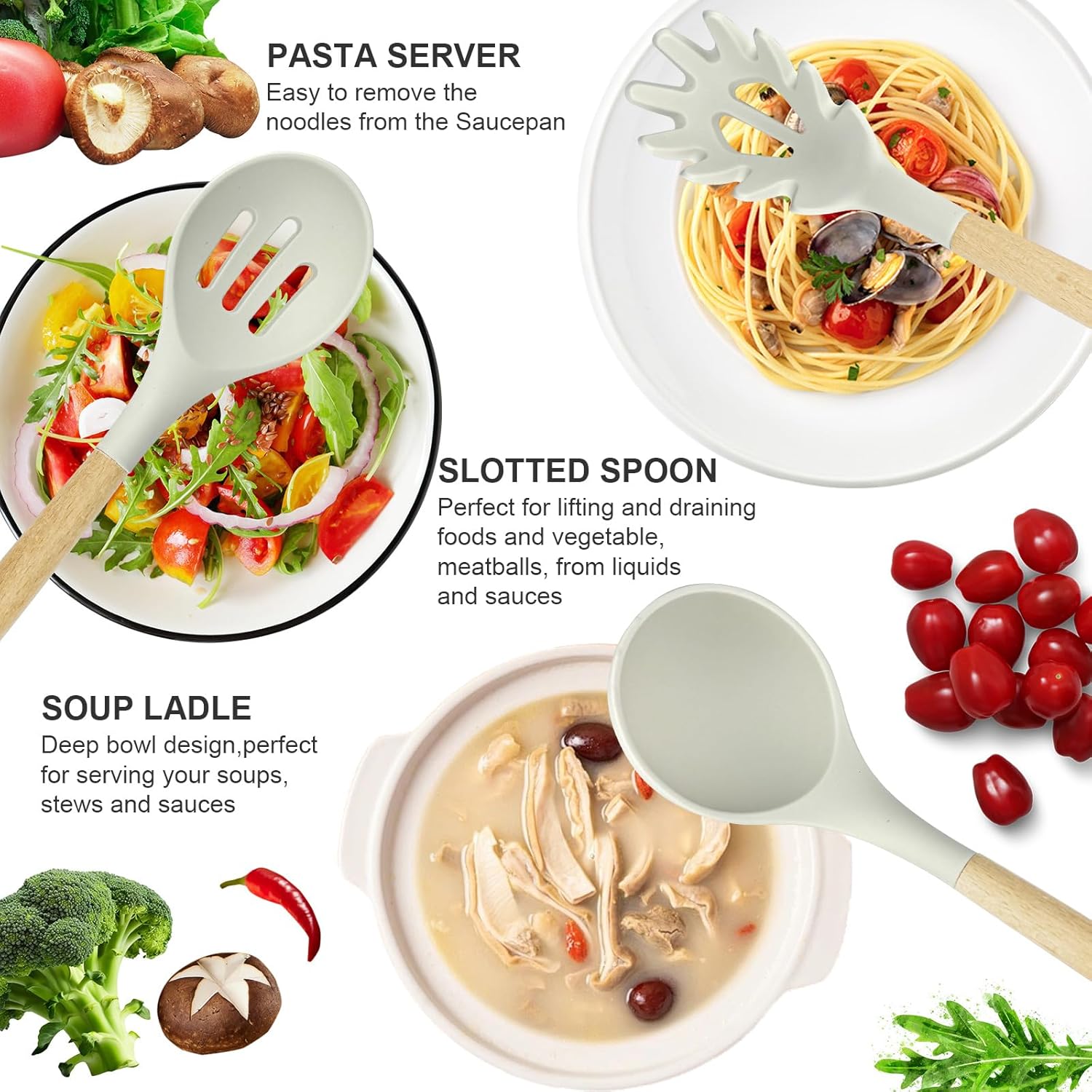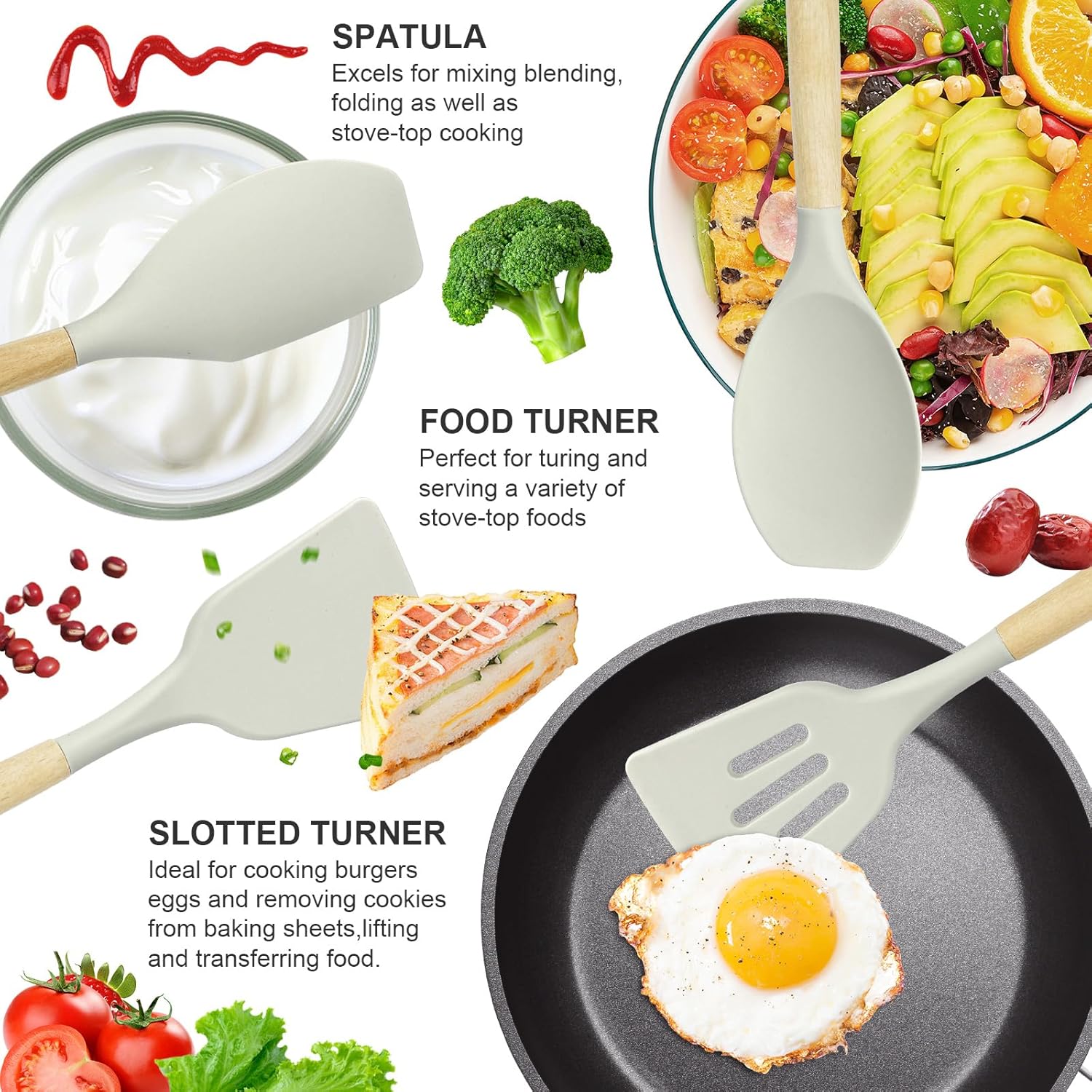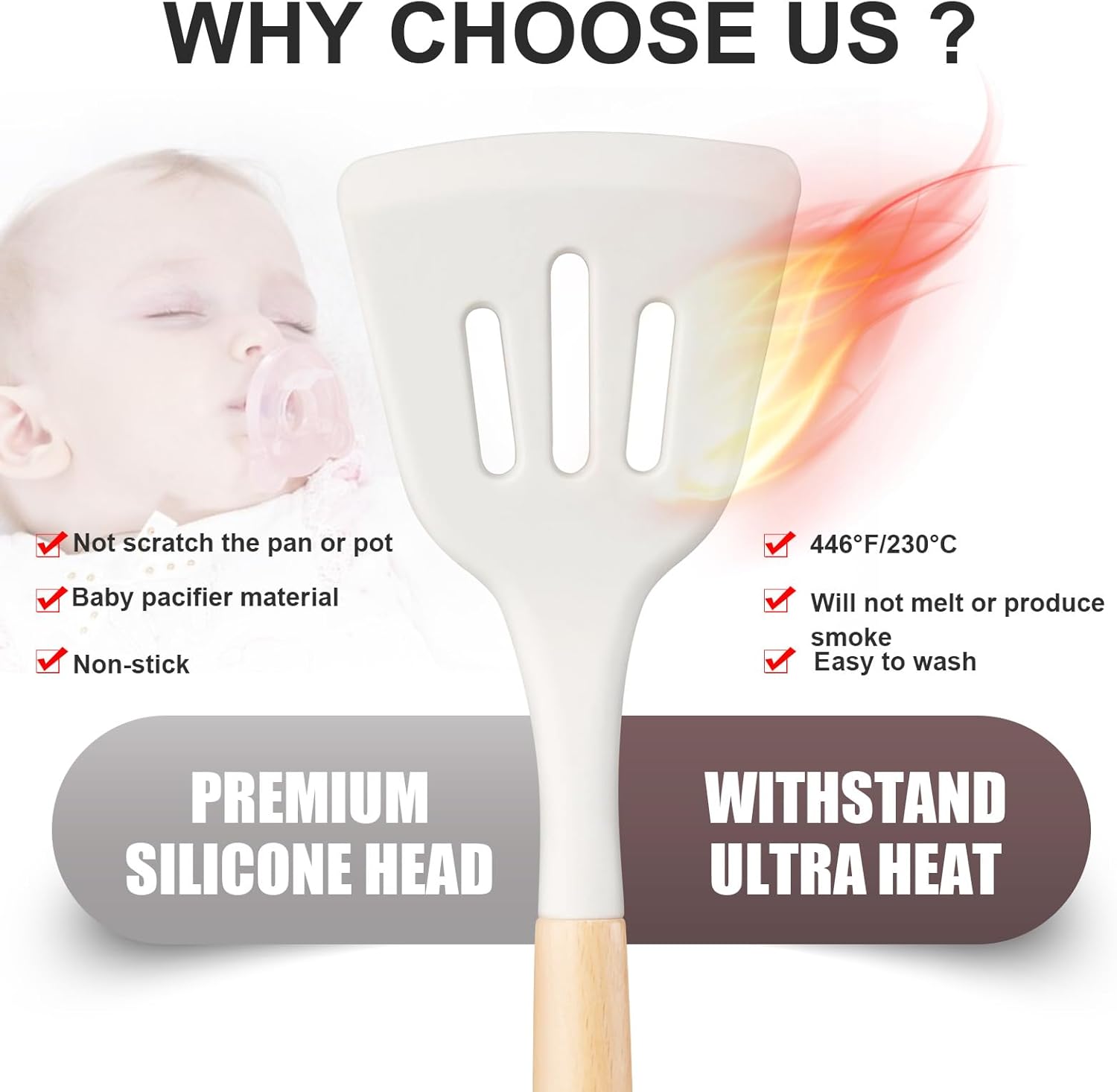 ✅ PRESERVE YOUR COOKWARE FOR YEARS by protecting it from scratches made by non silicone cooking tools. Your pots, pans and pocketbook will thank you! And how many times have you set your cooking tool down to come back to an ugly deformed spatula turner and a ruined melty plastic-infused dinner? This high quality non-stick silicone and wooden kitchen tools set means NO MORE MELTING PLASTIC KITCHEN ACCESSORIES!