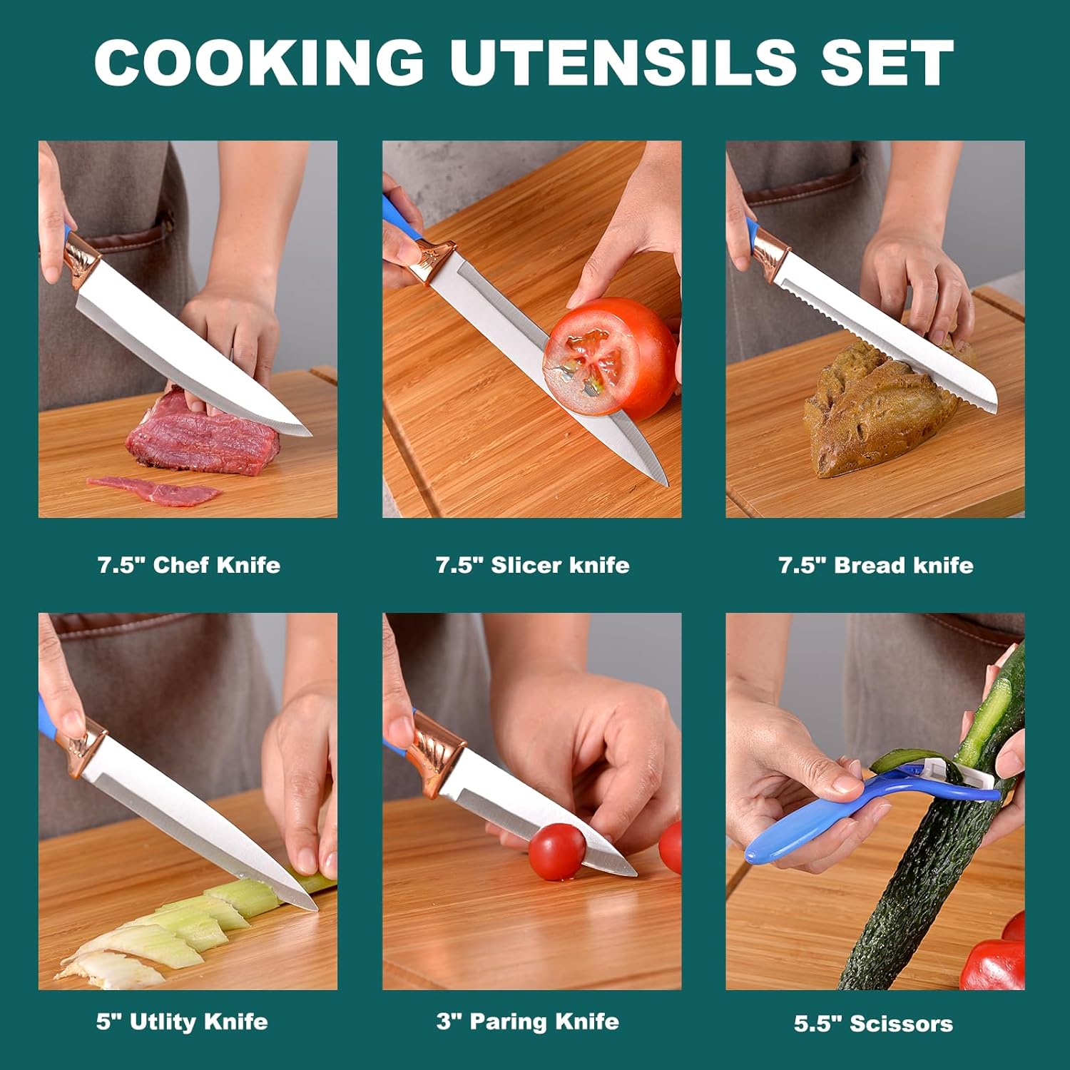 【The Ultimate 13-Piece Blue Kitchen & Knife Set Combo】 Discover the ultimate culinary solution with our all-in-one 13-piece kitchen utensils set. This comprehensive cooking utensils set uniquely combines 6 premium silicone cooking tools with a complete 5-piece knife set and a sleek storage stand. It’s the perfect starter kit for any kitchen, designed to work seamlessly with all your essential kitchen appliances.