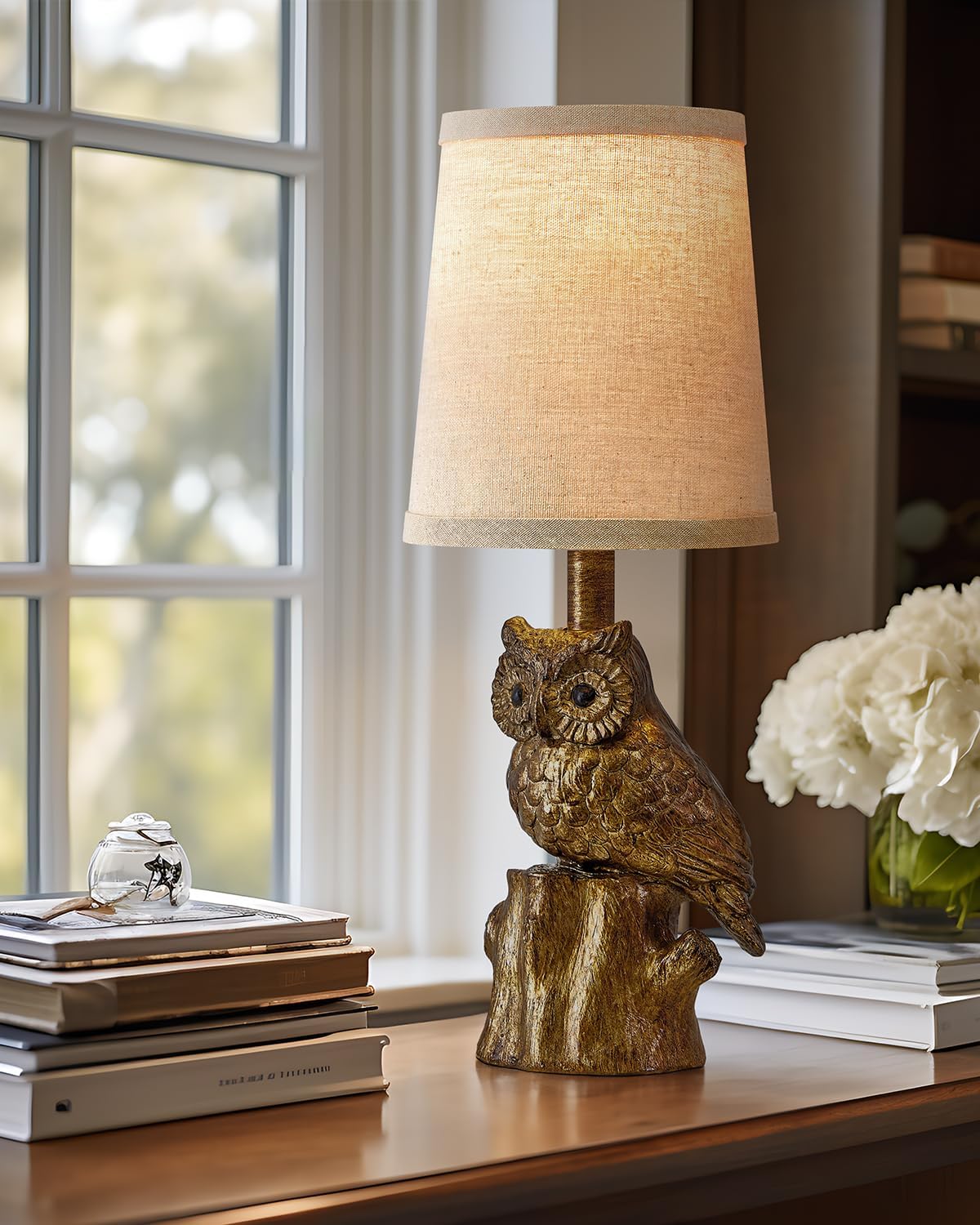 FARMHOUSE STYLE: This small antique gold table lamp features a high quality resin body and a linen shade, owl lamp animal lamp with soft lighting to create a classic farmhouse style suit for living room bedroom and office room