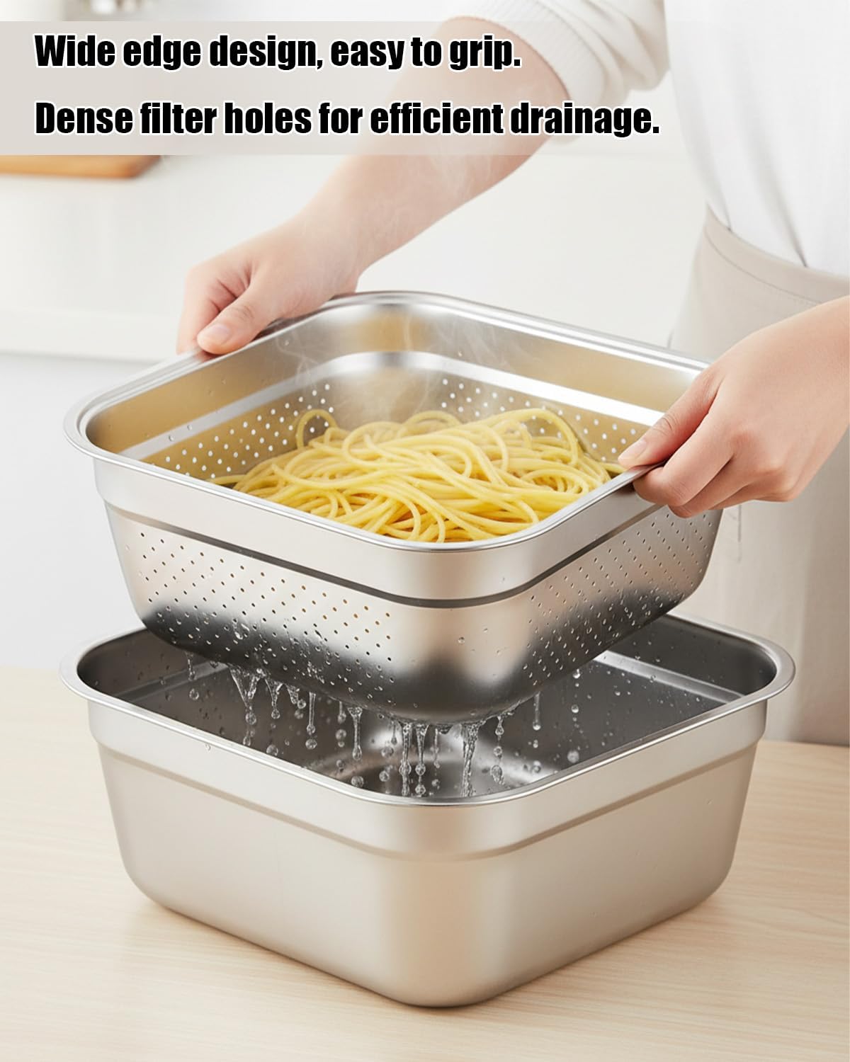 Q: Are the holes small enough to wash rice or quinoa without them falling through? A: Yes, this is designed as a Rice Washing Bowl. The colander features precision micro-perforations. These holes are small enough to retain rice grains, lentils, and orzo while allowing water to drain rapidly. You won’t lose your food down the drain!Q: Why choose a square shape over a traditional round colander? A: More Capacity & Better Fit. The 12.8″ square design utilizes the corners of your sink, providing significantly more volume than a round bowl of the same width. It’s perfect for washing large batches of leafy greens, soaking bulky vegetables, or defrosting large cuts of meat.Q: Can I use the colander to drain boiling hot pasta water? A: Absolutely. Unlike plastic colanders that can melt or warp, our set is made from premium heat-resistant stainless steel. It is perfectly safe for draining boiling water from pasta, potatoes, or blanched vegetables.Q: Do the two pieces nest together perfectly? A: Yes. The colander (inner strainer) fits snugly inside the solid dish tub. You can use them together to soak produce (lift the inner basket to drain instantly) or separate them to use as two independent kitchen tools.Q: Is there a gap at the bottom for draining? A: When nested, there is a small clearance designed to allow water to drain away from your food when you lift the inner colander, making it the ideal system for washing fruits and veggies without letting them sit in dirty water.