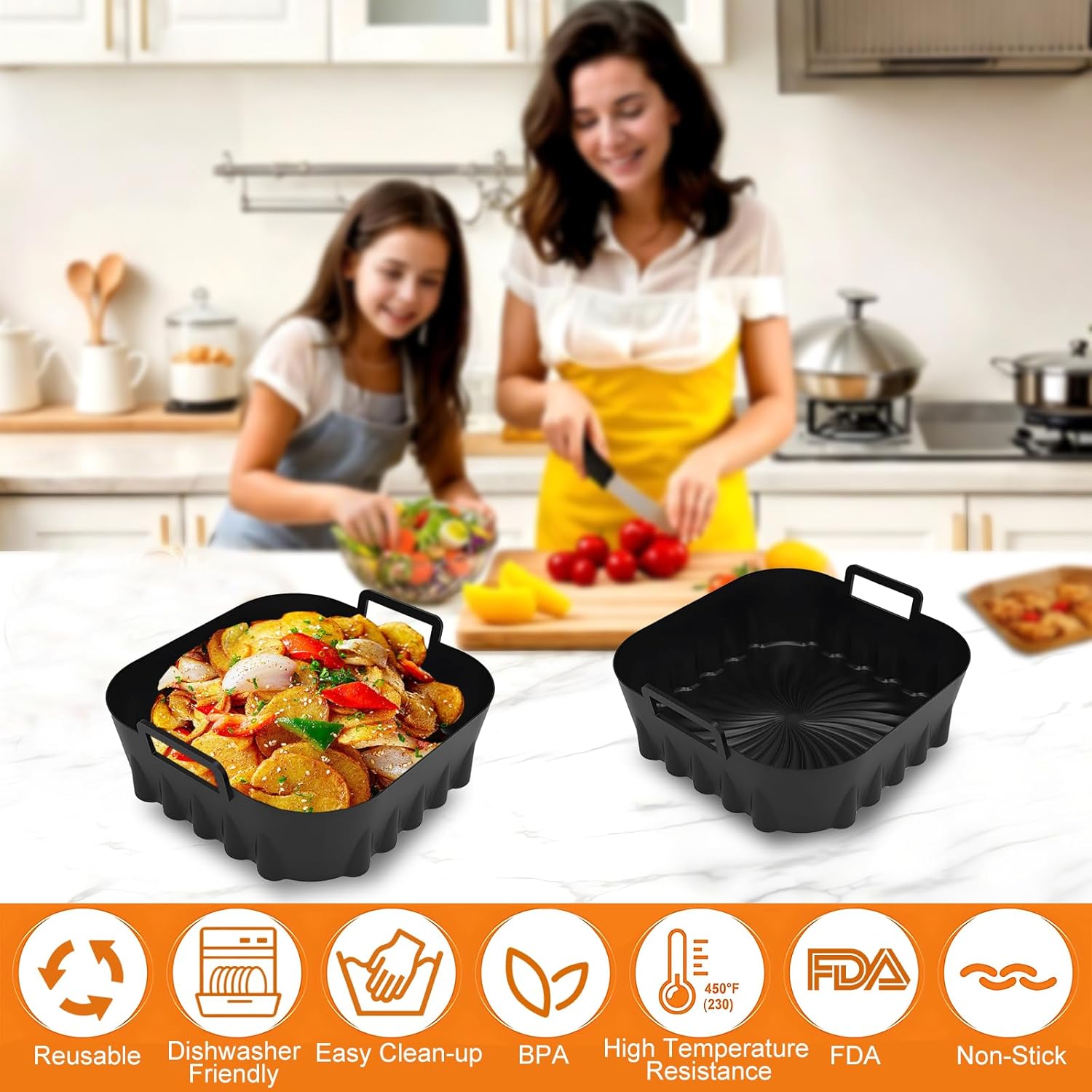 2 Pcs Square Air Fryer Liners: The silicone air fryer liners measures 7.8 inches on each side, 2.36 inches in height, with a diagonal length of 9 inches—perfectly sized to fit most 4 to 7-quart air fryers. The upgraded, thickened walls of the air fryer silicone liners provide excellent structure and support, making it a reliable, all-in-one solution for your air frying needs.