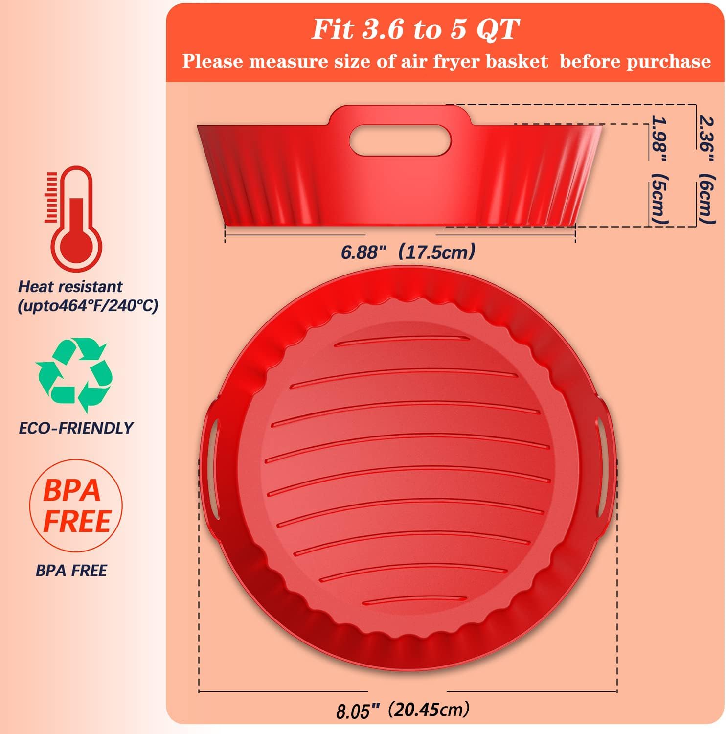Thickened Silicone Air Fryer Liners 2 pcs: Our air fryer silicone liners are thicker, it’s about 0.06 inch, it’s not flimsy. Size is 8.05*1.98 inches, fit for 3.6 to 5 QT air fryers. Tips: Please check your air fryer size before purchasing
