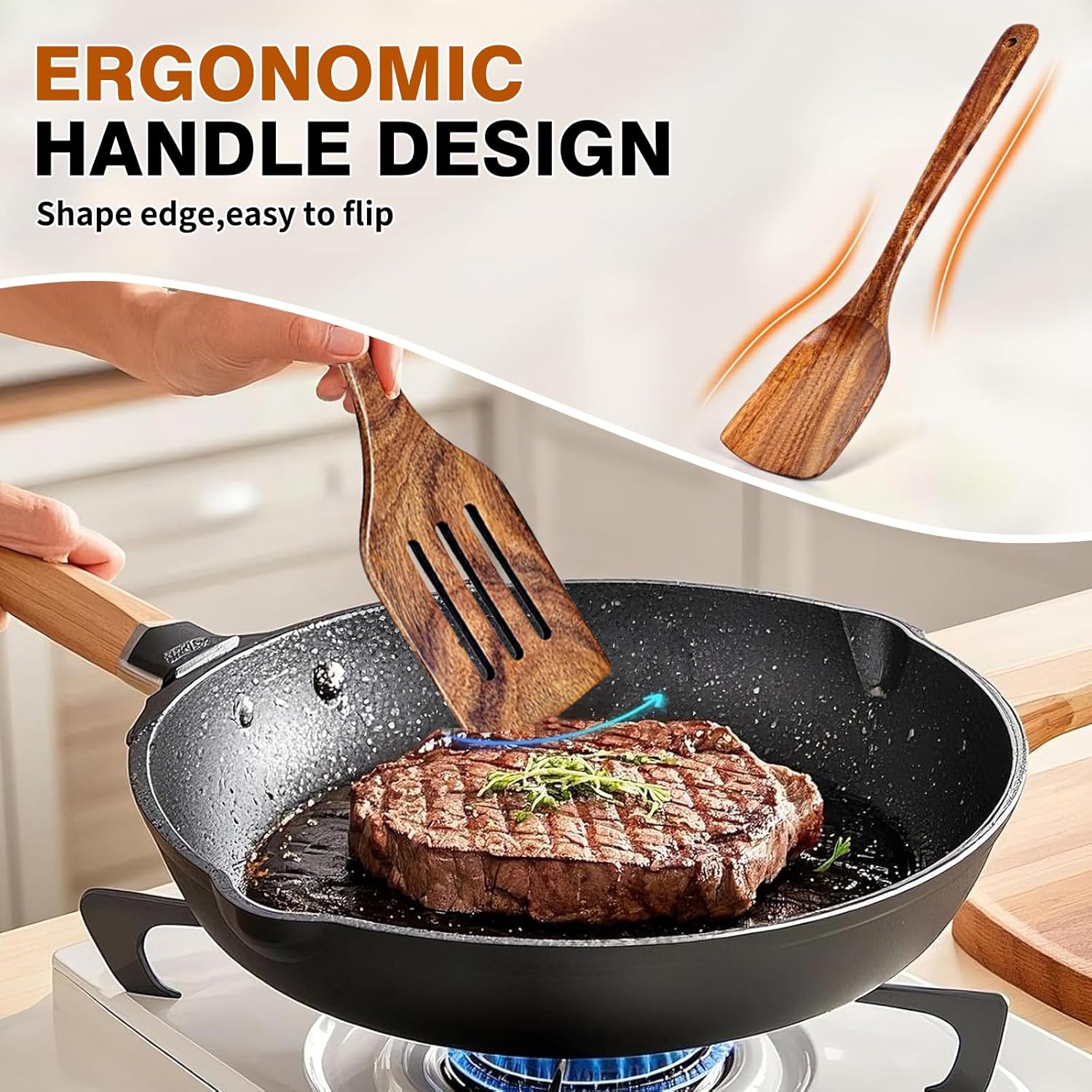 【NONSTICK COOKWARE SAFE】Our wooden utensils are crafted through a special process, undergoing multiple steps of meticulous sanding to achieve a flawlessly smooth finish. Angled edge design (approx. 25 degrees) supports pan contact during use