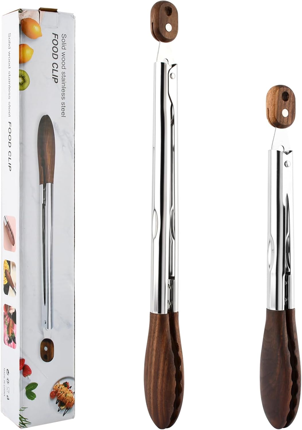 【Safe Materials】These kitchen tongs with wooden clips are made from food-grade walnut wood and stainless steel, making them more durable, rust-resistant, and healthier than silicone clips, and free of microplastics. The natural wood clips gently contact cookware surfaces, preventing scratches on non-stick pans. This combination of materials provides a healthier cooking experience while ensuring durability in various kitchen environments.