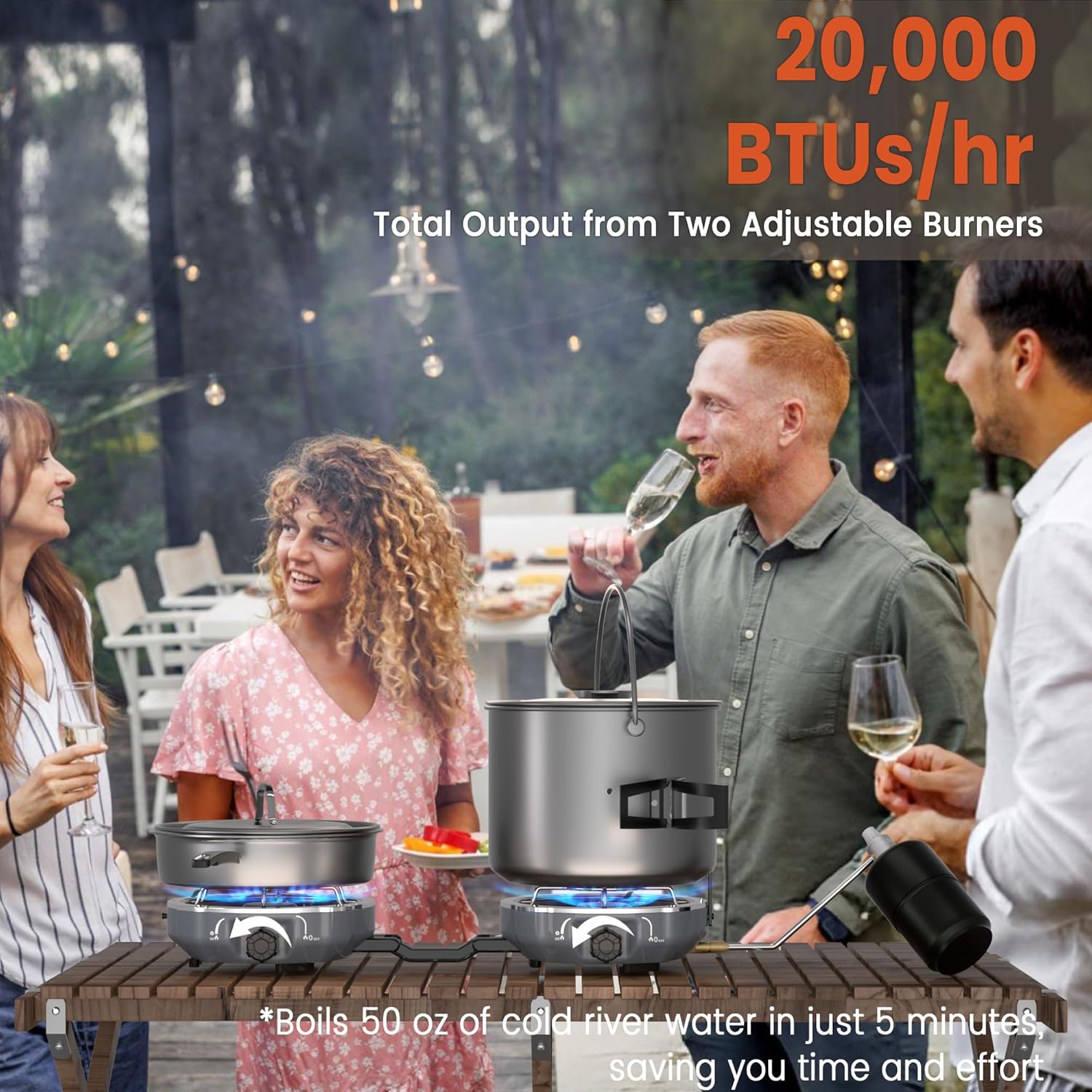 Dual Burner with Powerful Heat Output: This portable camping stove features two burners with a combined 20,000 BTU output, making it ideal for cooking multiple dishes outdoors. Whether you’re using it as part of your camping cooking set or need a reliable backpacking stove for your adventures, it delivers the power and convenience you need for outdoor meals