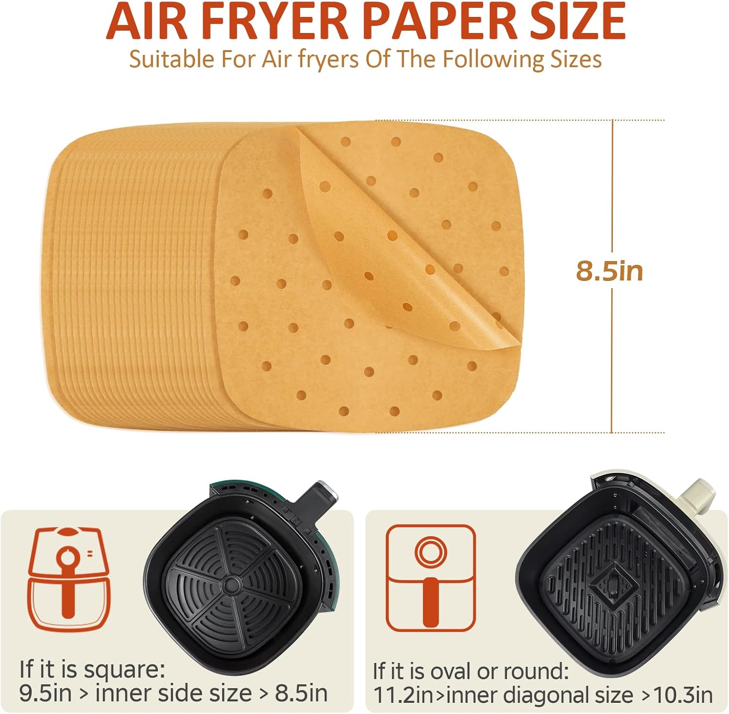 Versatile Use:8.5 inch air fryer disposable paper liners fit for 8.5 to 9.5 inch square air fryer or cake pan, fits round or oval air fry, steamer basket as well from sizes (diagonal length) of 10.3 inch to 11.2 inch