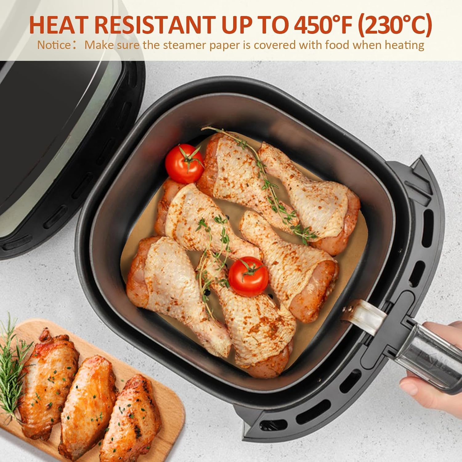Heat-Resistant: The steamer paper can withstand temperatures up to 450°F (230°C) without warping or burning, please be careful not to put the parchment paper squares without food directly into the air fryer
