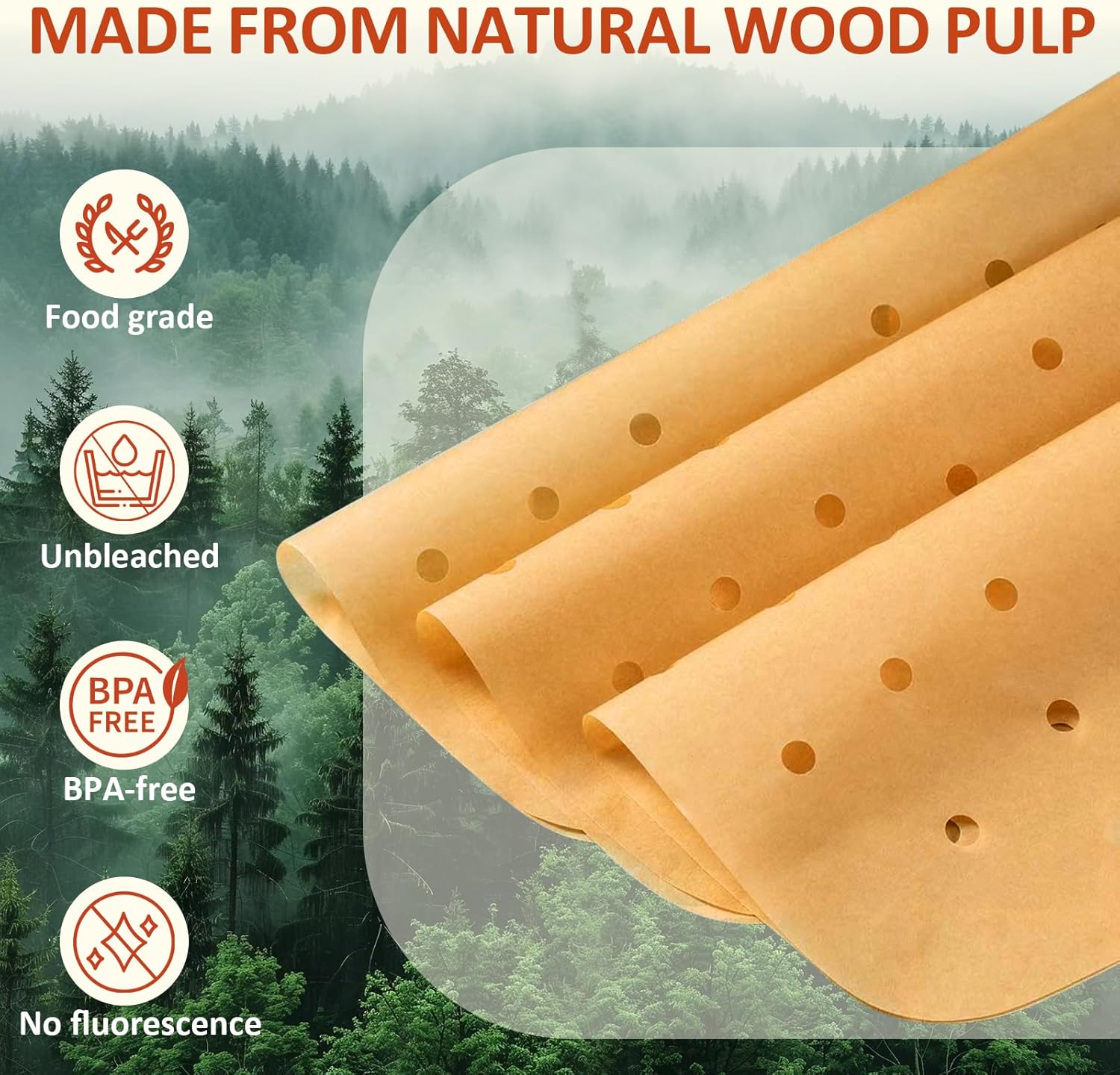 Save Time and Effort: Precut design for direct take-out and use, the perforated air fryer paper allows excess oil to drip down into the air fryer basket below, making your cleaning much easier