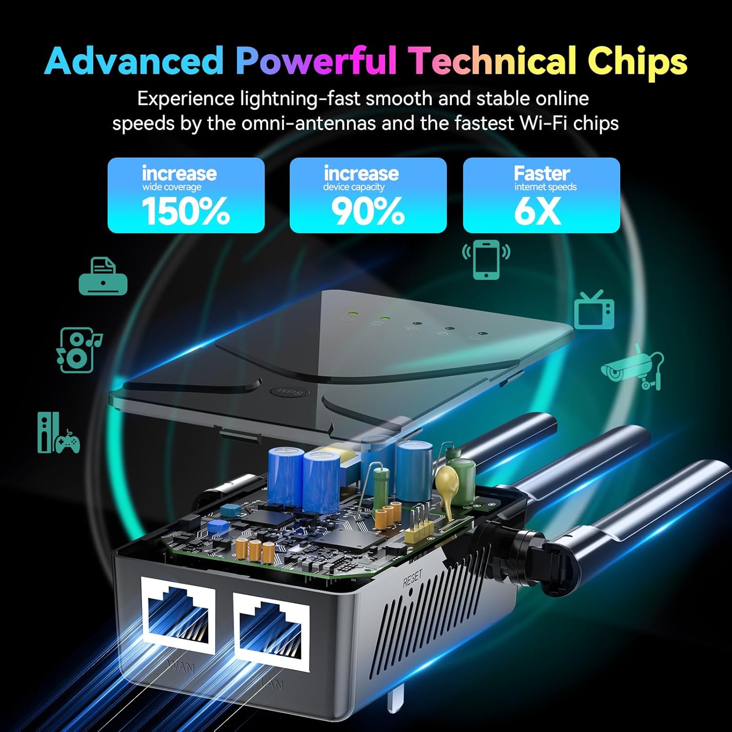 𝙇𝙖𝙧𝙞𝙧𝙜𝙧 𝙒𝙞𝙁𝙞 𝙀𝙭𝙩𝙚𝙣𝙙𝙚𝙧 𝙂𝙞𝙫𝙚𝙨 𝙔𝙤𝙪 𝙐𝙣𝙚𝙭𝙥𝙚𝙘𝙩𝙚𝙙 𝙀𝙭𝙥𝙚𝙧𝙞𝙚𝙣𝙘𝙚:4 High-Gain Antennas & Smart IC Chip For 360° Extension- Coverage Up to15555+Sq. Ft , No Signal Blind Spots | WPS One-Click Setup, No Tech Skills | WPA Military-Grade Security | Dual Gigabit Ethernet Ports, 0 Lag | 5 Modes Fits All Scenarios | Faster Stable Speed for 4K Streaming/Gaming | Indoor/Outdoor Use, Dead Zones Eliminated | Wall Penetration, Multi-Floor Coverage