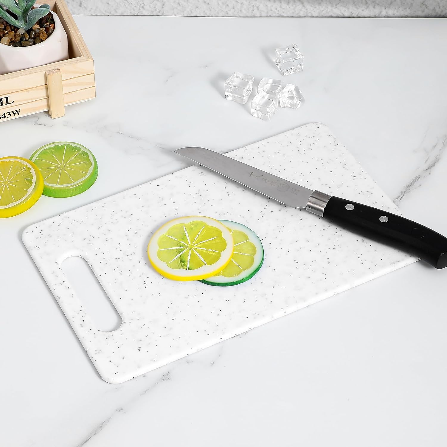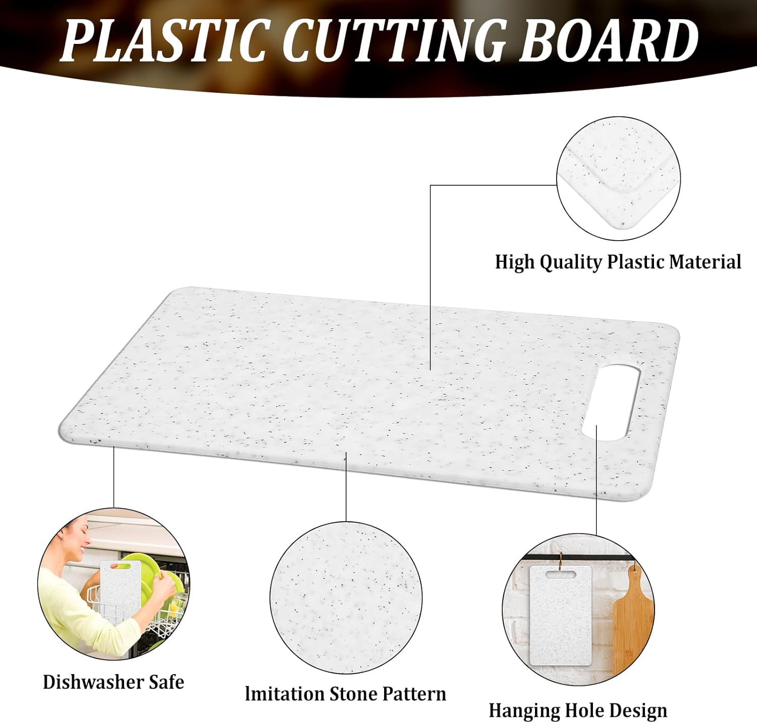 【Package Includes】:There are 2 pieces of plastic cutting boards for kitchen in white color, simple but classic, which are enough to meet your uses and replacements, you can use a small cutting board to cut raw and cooked food separately for more durability