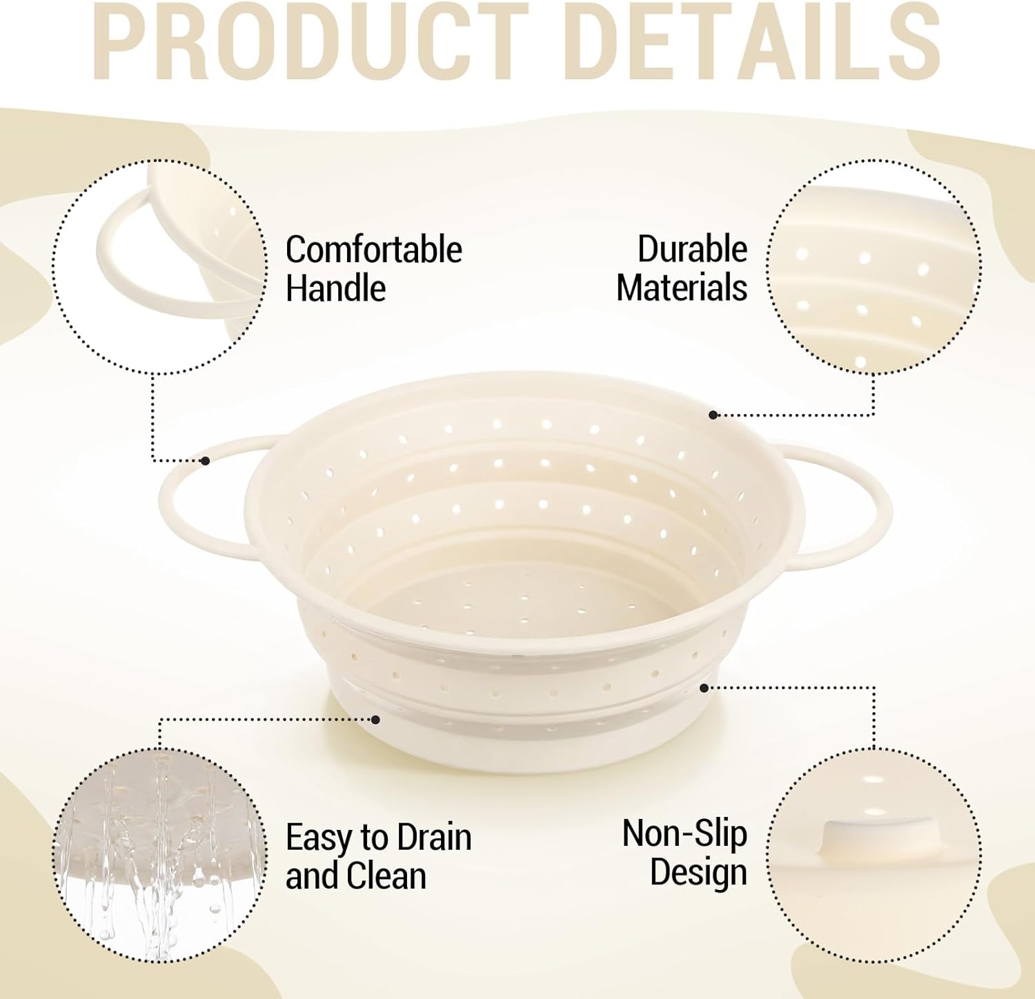 Safe and Quality Silicone: crafted from BPA-free silicone and reinforced plastic, each silicone colander withstands heat and resists deformation; The soft yet sturdy material ensures easy handling while keeping your food safe during washing or draining