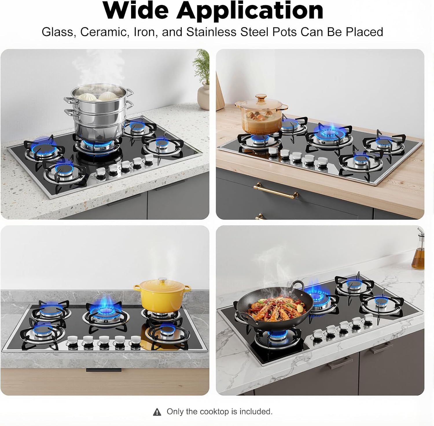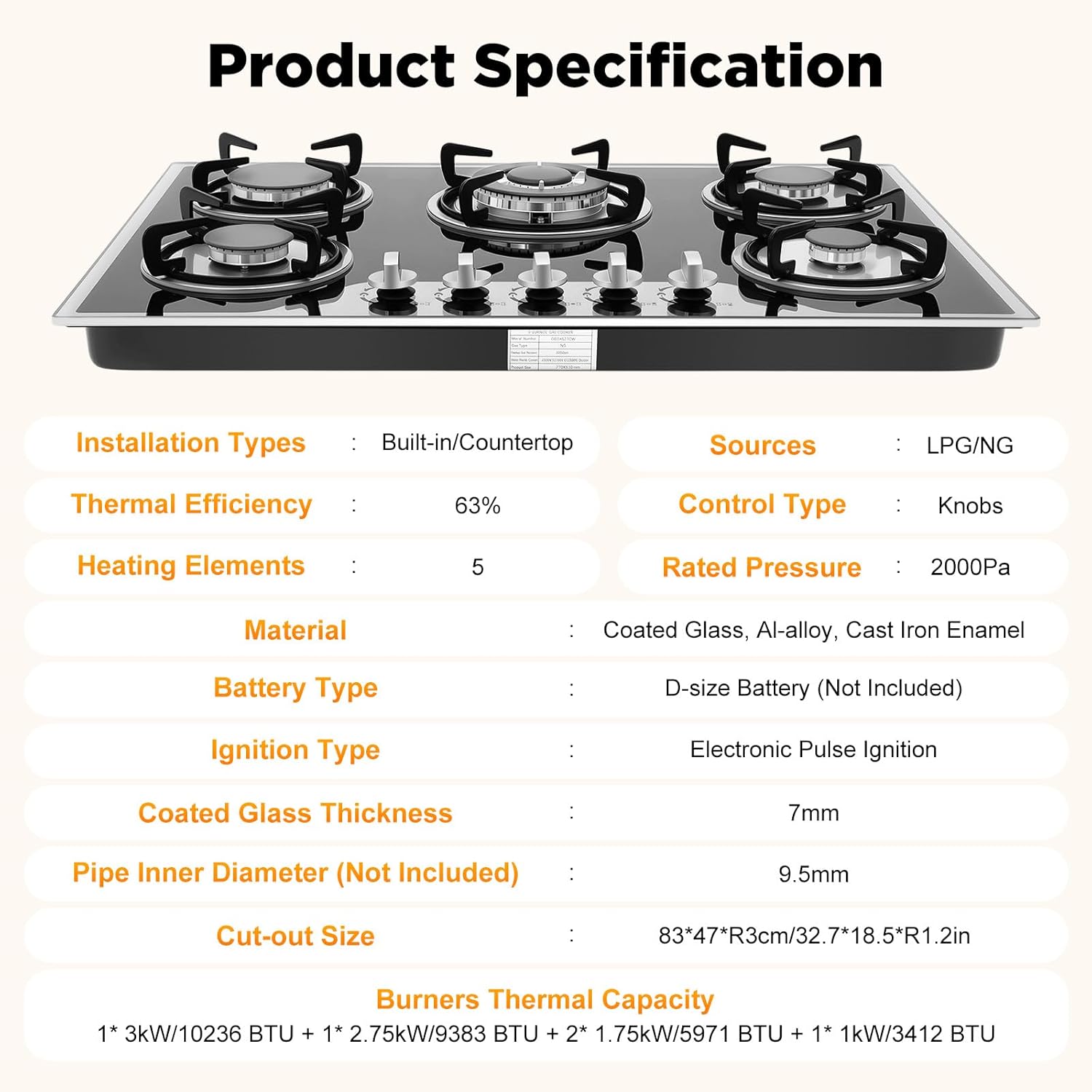 Efficient Cooking: The spacious cooktop (30.5×20.1×2.6in) has five independent burners, allowing multiple people to cook various dishes simultaneously. It greatly improves cooking efficiency, especially suitable for large families.