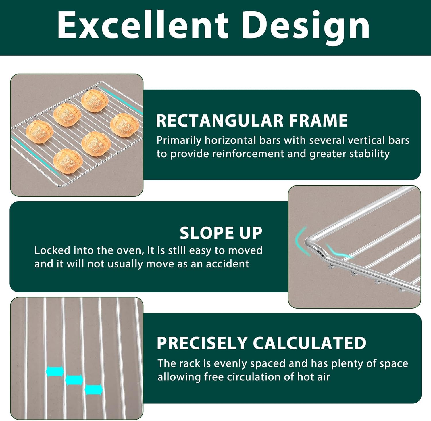 Excellent Design: Precisely calculated and sturdy. Breville toaster oven wire rack has excellent thermal conductivity, air circulation and even heat distribution, helping breville oven rack to create delicious food and multiple ingredients at the same time, such as baking bread, cookies, pizza, or chicken and so on, saving your time