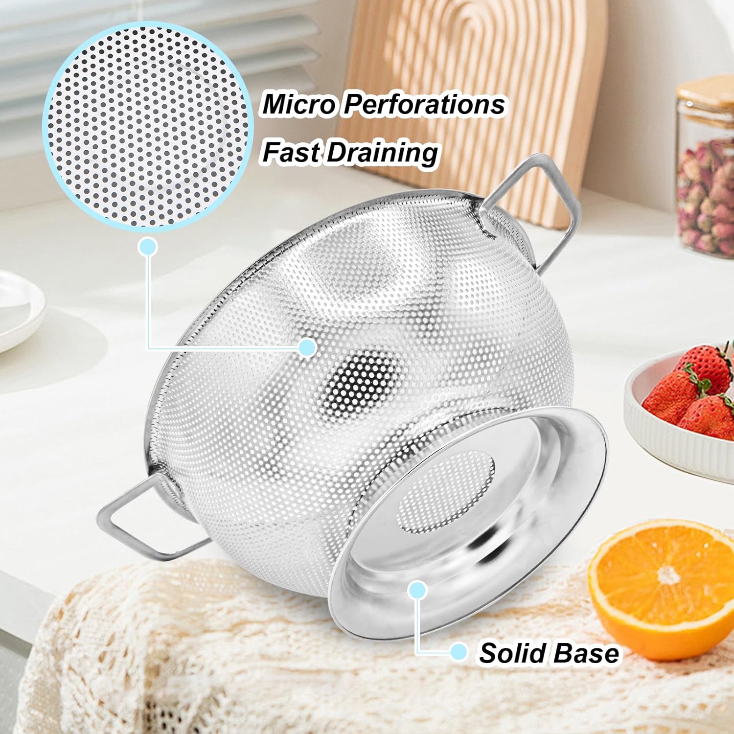 3 QT stainless steel colander: wash fruits, drain pasta.Food-grade, no harmful chemicals—safe, family-friendly.Sturdy, resists bending under heavy loads. Durable daily use.Fast draining, eases prep. Handles: safe hangs, saves space.Nests compactly—good for small kitchens. Easy clean.