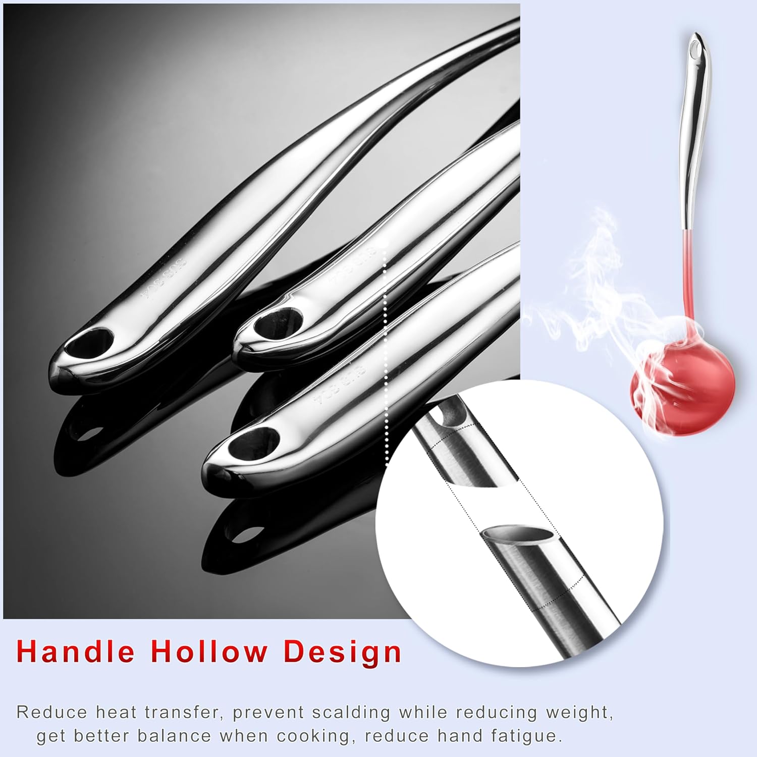 【Easy To Use and Store】: The handles are hollow, so they’re not so heavy, helps to eliminate stress on the arms, the handles are temp proof so they won’t burn your hand. With big hanging holes, easy to be hung to save space.