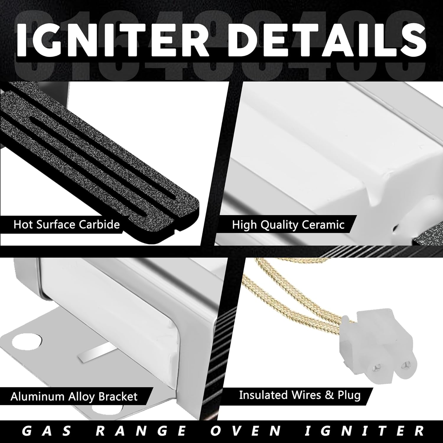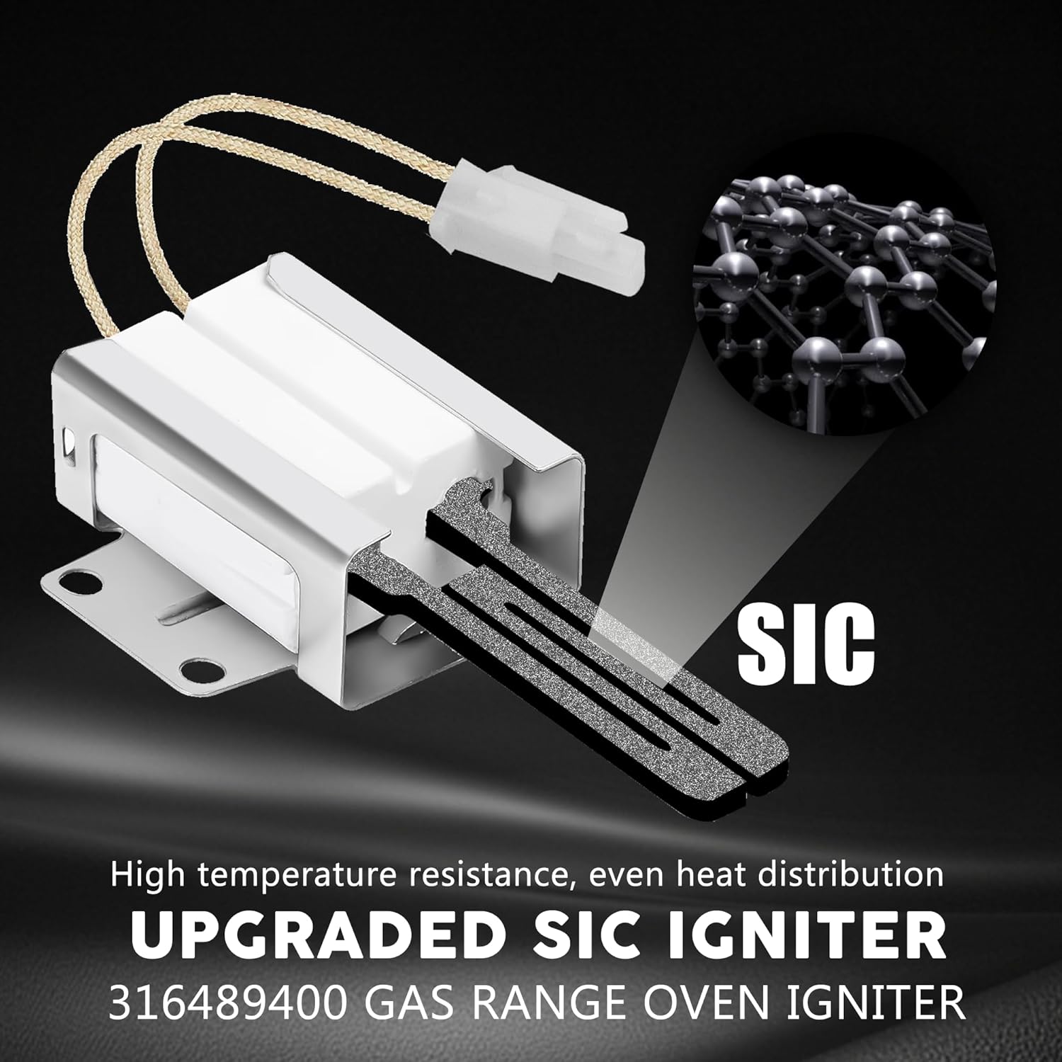 【Upgraded Igniter】316489400 Oven Igniter replacement for Frigidaire equipped with a connector plug,two ceramic nuts and a high-temperature stainless steel cover to protect igniter. Made of premium silicon carbide materials,which is tested by multiple processes to exceed OEM standard. 316489403 igniter for gas oven can helps the lighter temperature quickly reach 2000-2800F in 1 minute, delivers quick and reliable ignition every time, making cooking a breeze.