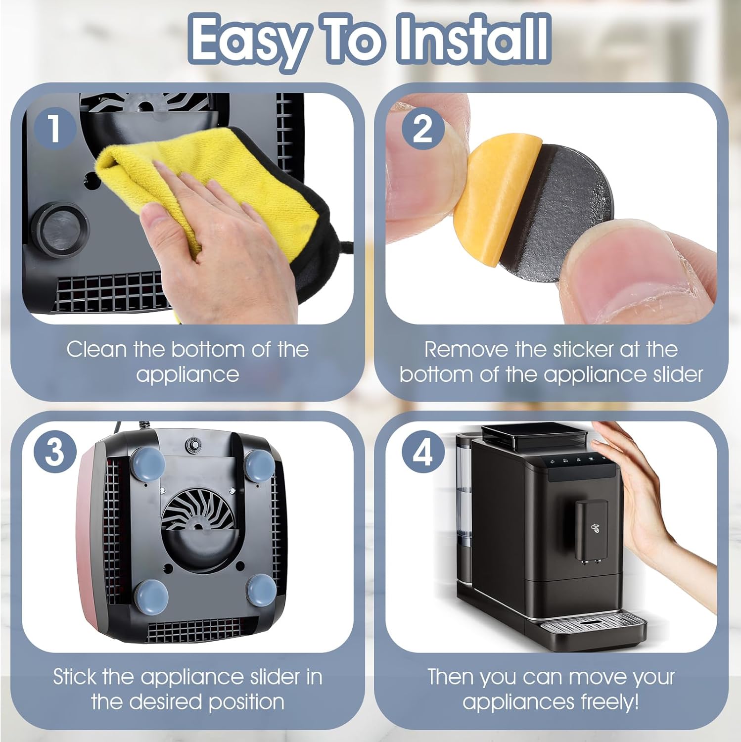 【Electrical Appliance Slide Set】You will receive 32 of our appliance sliders. Our kitchen organization silders are designed for heavy-duty kitchen appliances and are easy to install, making it easier and less laborious to move your appliances.