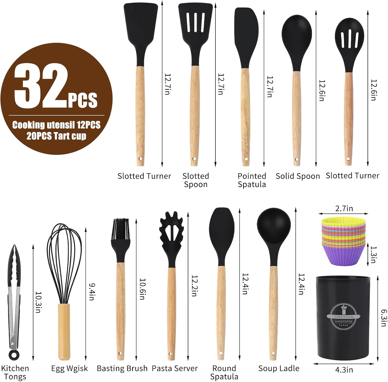 Silicone cookware kitchen utensil set, 12 silicone cooking utensils with wooden handles, and 20 reusable silicone cake baking cups cooking utensil set
