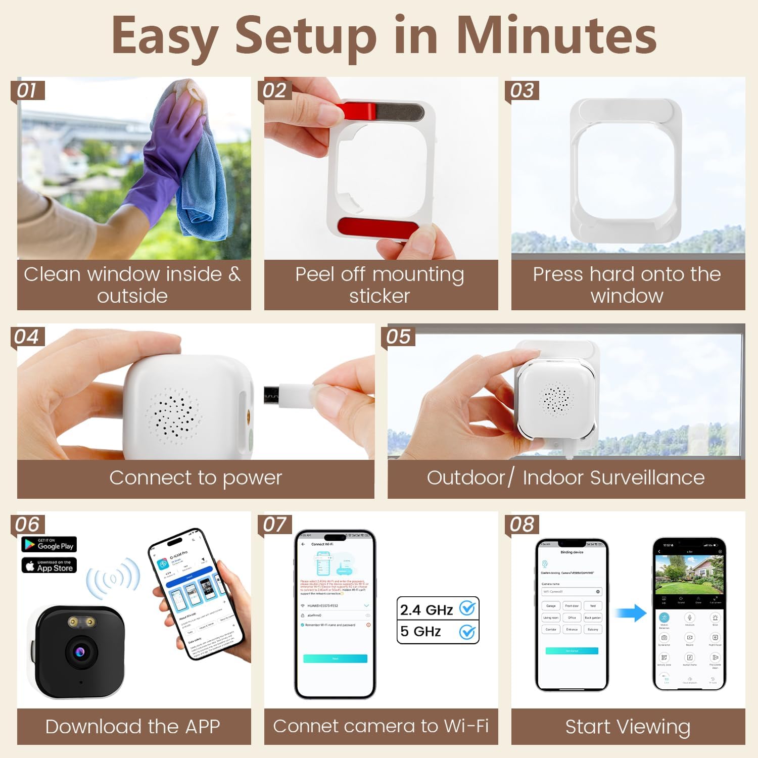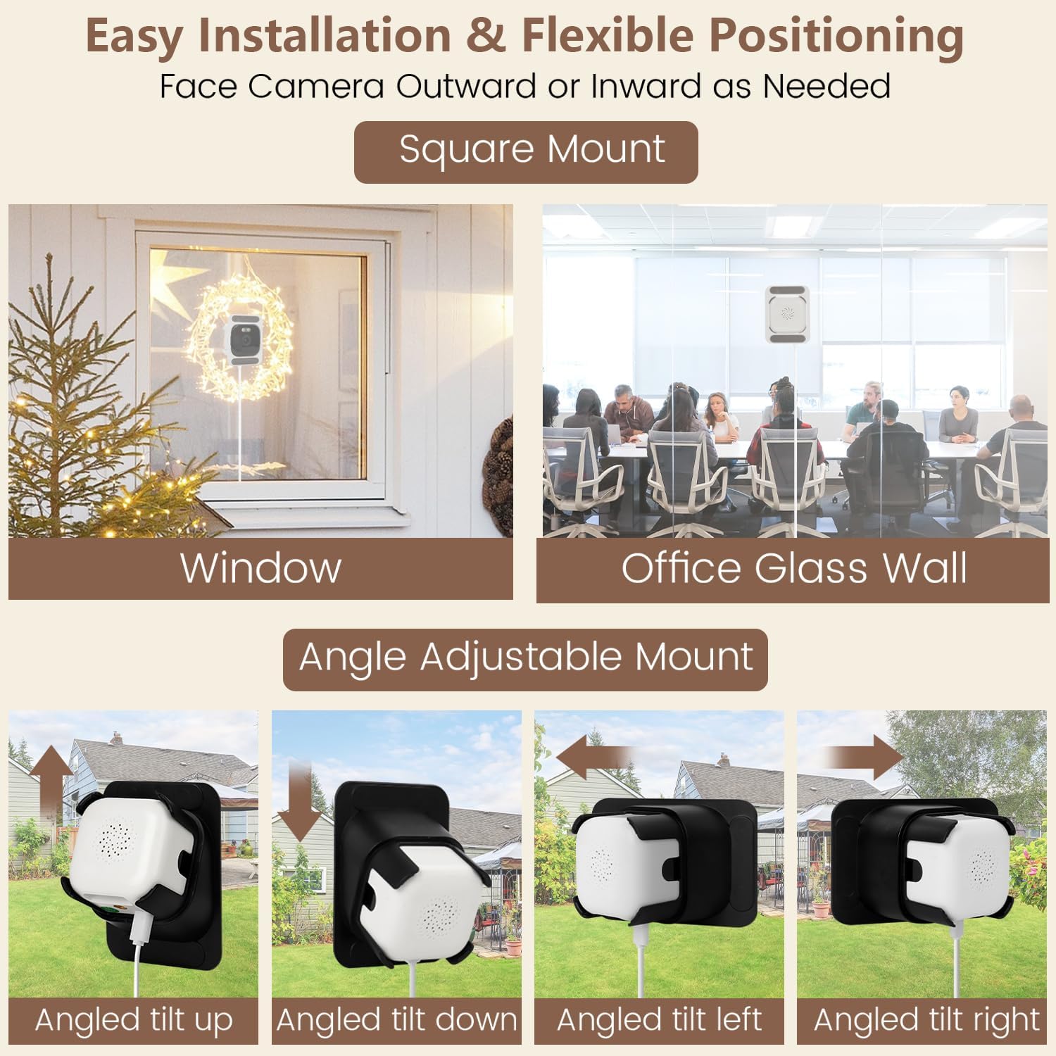 【No-Drill Window Mount & Versatile Placement】Experience tool-free installation that attaches securely to windows, glass doors, or even fish tanks in seconds using the included mounting sticker. The package includes both flat and 45° adjustable brackets for flexible positioning. Perfect for apartments, villas, offices, and nurseries—this versatile camera leaves no residue or damage. Monitor front porches, backyards, aquariums, or pet zones with effortless flexibility.