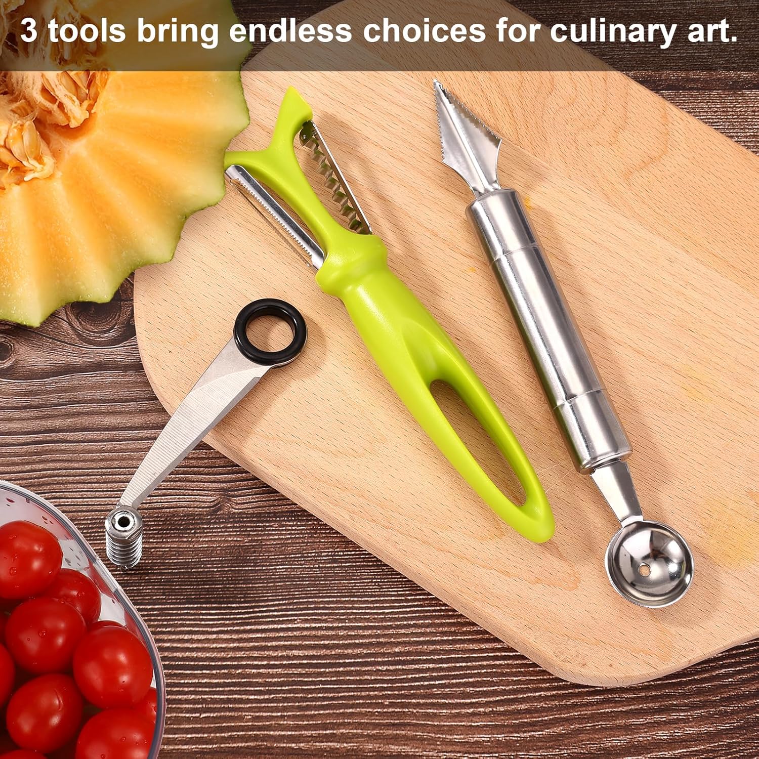 Wide Application: There are countless possibilities for culinary art using the 3 types of kitchen utensils. The spiral knife may be used to produce uniformly smooth spirals out of potatoes, carrots. The V-shape carving tool can be used to construct beautiful watermelon baskets. The peeler can help peel off skin of vegetable easily.