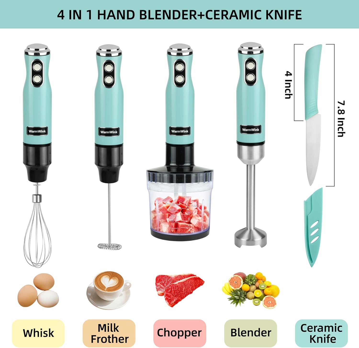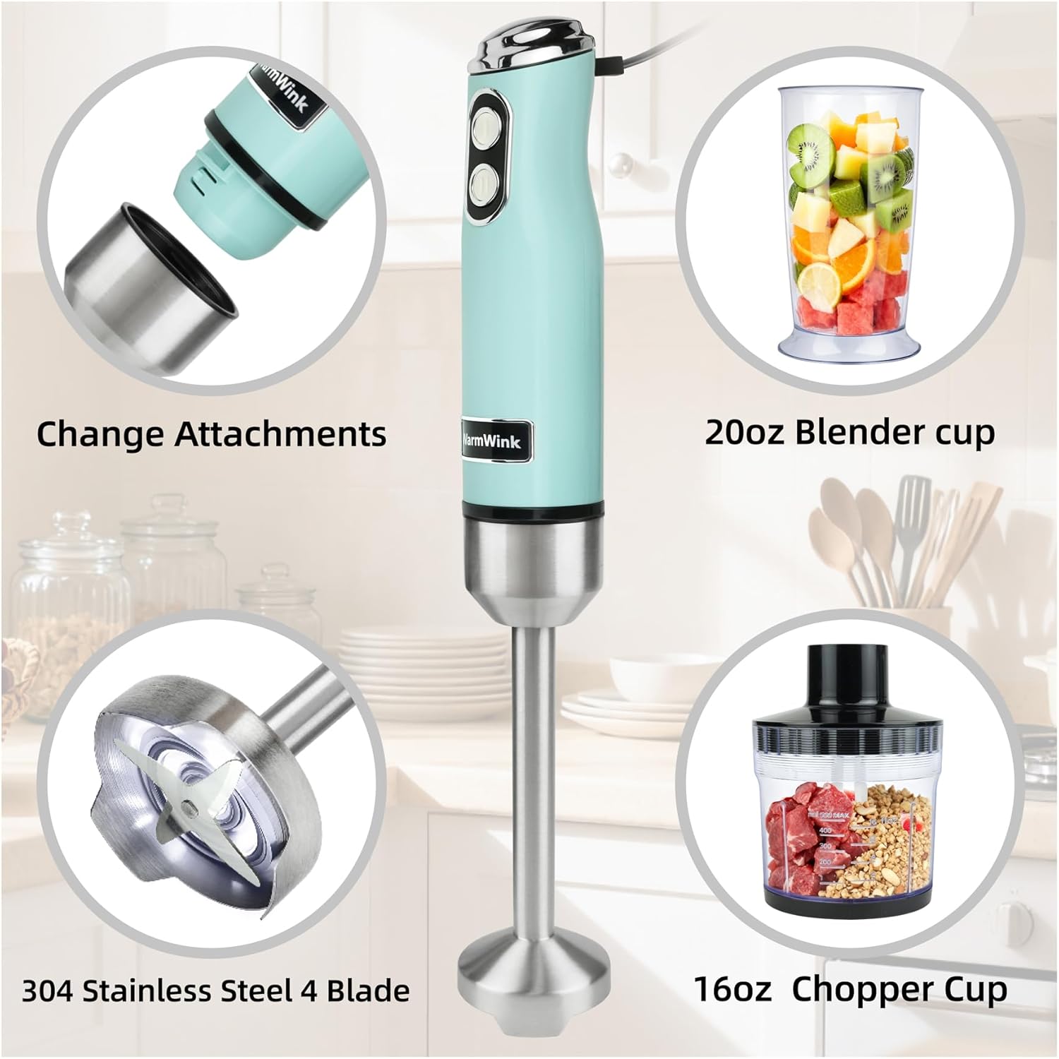 4 in 1 Corded Hand Blender Includes Food Chopper, Mixing Beaker Milk Frother and Whisk 600W Handheld Blender with Stainless Steel Blade, Baby Food Blender
