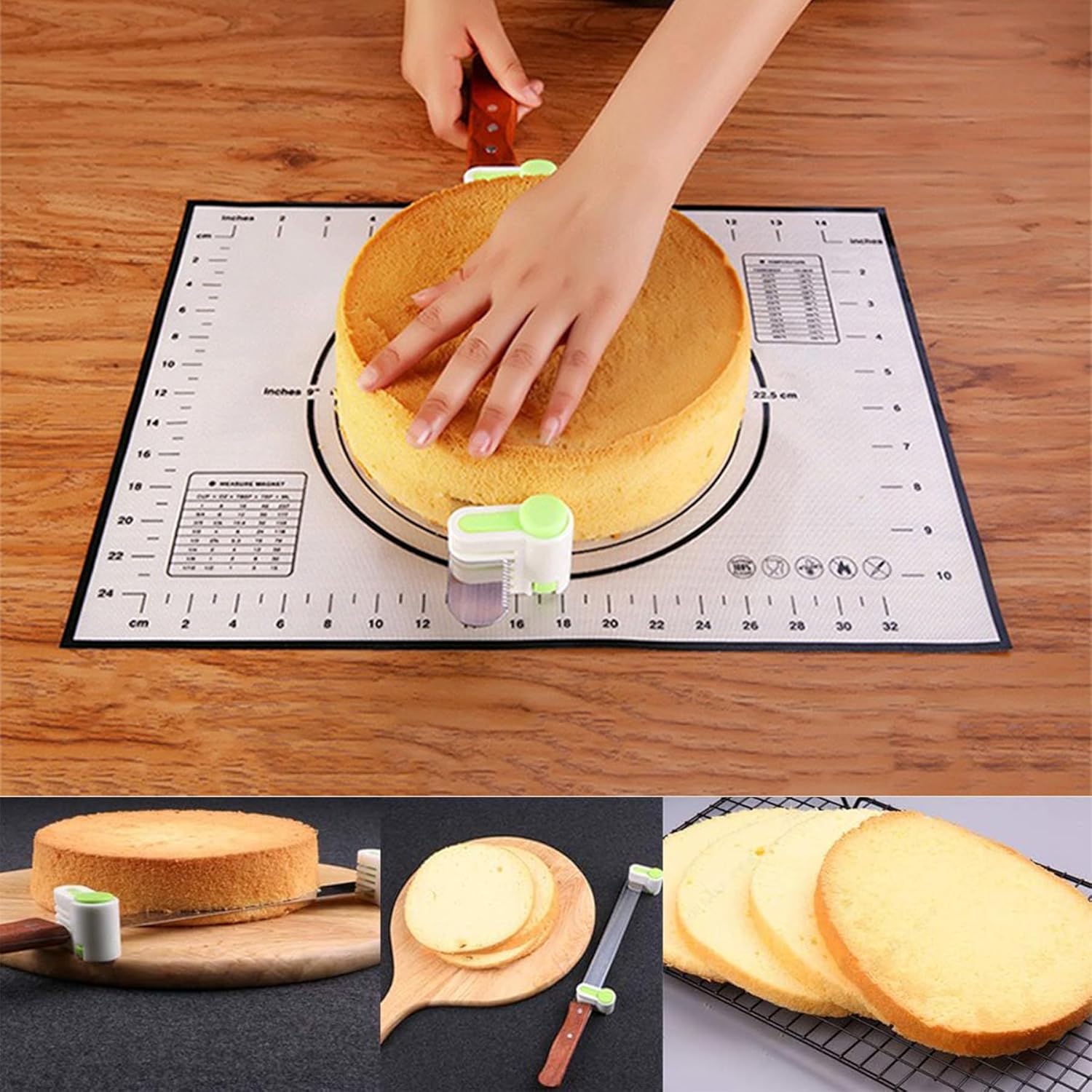 Ready to elevate your baking skills? Our slicer is incredibly easy to use – simply press the buttons to clamp the blade and move it horizontally across a flat surface for flawless slices every time.