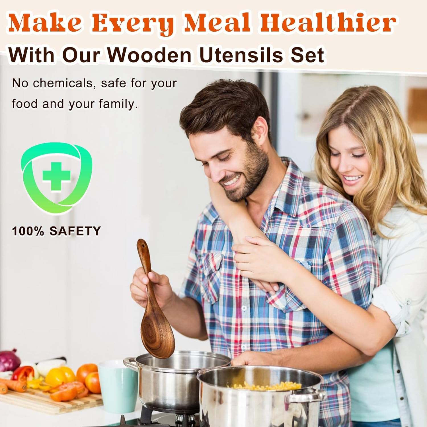 【Eco-Friendly Wooden Utensil Set】 Our cooking utensils set is made of natural acacia wood, which is healthy and safe. It it known for its dense grain and natural resilience, making these kitchen utensils crack-resistant, heat-resistant, will not melt due to high temperature like rubber one. Besides, acacia is completely biodegradable, using this wooden spatula reduces reliance on plastics, helps minimize environmental impact, and ensures safety for both you and the planet.