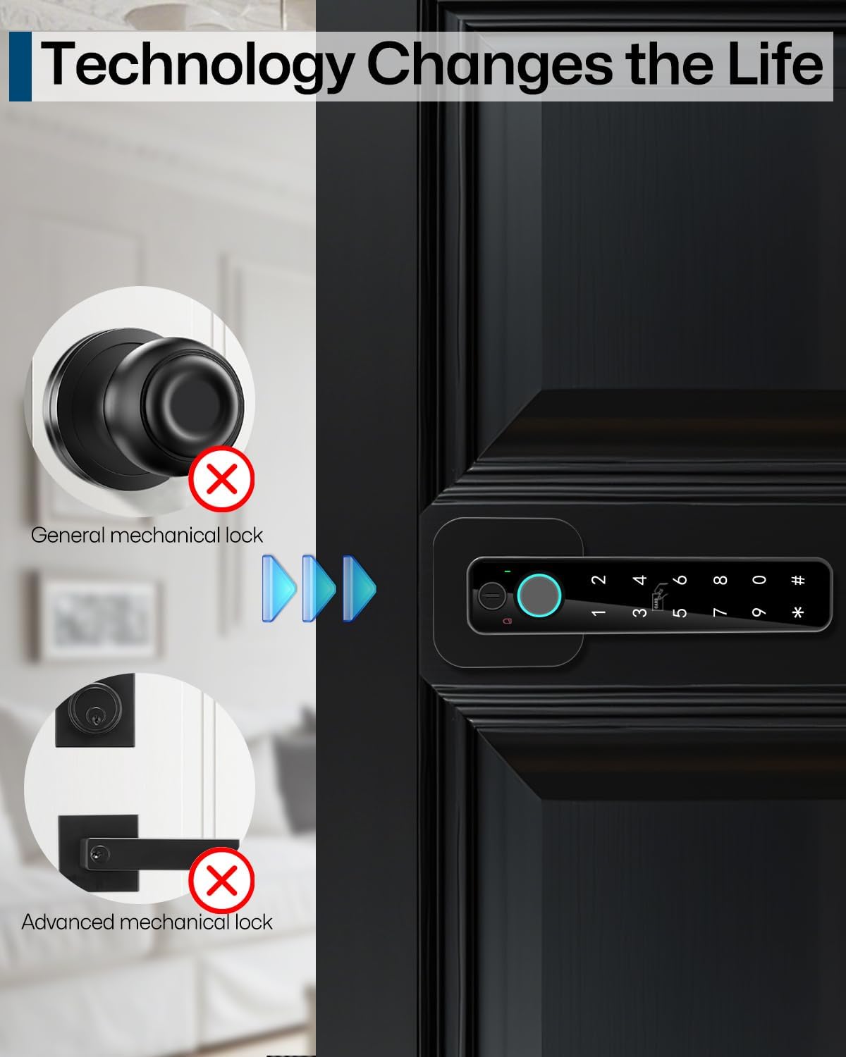 5-In-1 Smart Door Lock: Open the smart door lock through fingerprint+App+password+card+mechanical key, Give your family more ways to open doors.