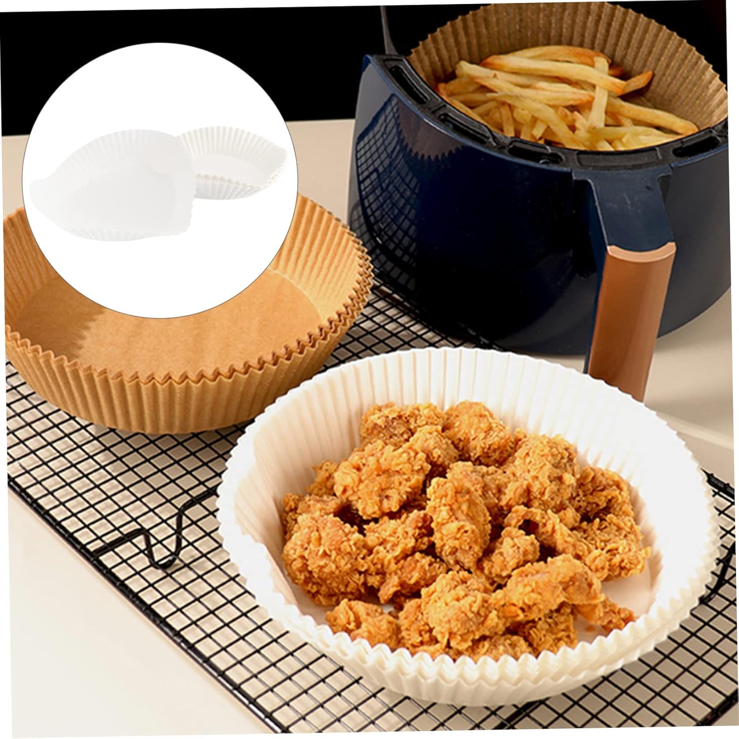 – Color: white disposable fryer liners.