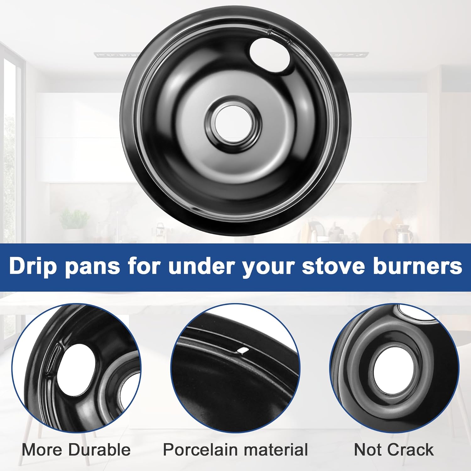 【MATERIAL-BLACK DRIP PAN BOWLS】Electric stove drip pans made of premium porcelain material, used on electric stoves, located underneath burner element, catching spills (oil/drops/food) leaking from the cookware on the burner during the cooking process, speeding up the cooking time, saving on energy costs and keep the kitchen clean. Replacement burner drip pans preventing stove burner elements from wobbling, thus preventing cookware from shaking on the stovetop and making cooking safe