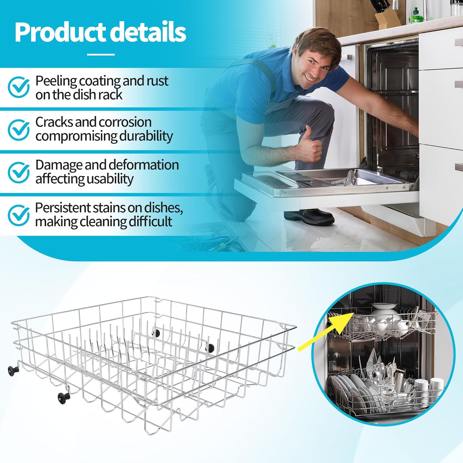 Strong Build & Long-Term Durability:Crafted from anti-corrosion–treated stainless steel, this dishwasher upper rack offers superior resistance against moisture, heat, and long-term chemical exposure inside the dishwasher environment. The strengthened joints and corrosion-resistant finish help prevent rust, deformation, and wheel breakage, making it ideal for families running multiple wash cycles per week. Built to stay sturdy and maintain its structure over time.