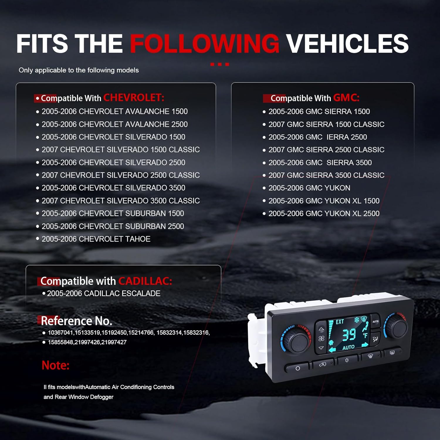 🔧🚘【Vehicle Fitment】CADILLAC ESCALADE 2005-2006 CHEVY AVALANCHE 1500 2005-2006 CHEVY AVALANCHE 2500 2005-2006 CHEVY SILVERADO 1500 2005-2006 CHEVY SILVERADO 1500 CLASSIC 2007 CHEVY SILVERADO 2500 2005-2006 CHEVY SILVERADO 2500 CLASSIC 2007 CHEVY SILVERADO 3500 2005-2006 CHEVY SILVERADO 3500 CLASSIC 2007 CHEVY SUBURBAN 1500 2005-2006 CHEVY SUBURBAN 2500 2005-2006 CHEVY TAHOE 2005-2006 GMC SIERRA 1500 2005-2006 GMC SIERRA 1500 CLASSIC 2007 GMC SIERRA 2500 2005-2006 GMC SIERRA 2500 CLASSIC 2007 GMC SIERRA 3500 2005-2006 GMC SIERRA 3500 CLASSIC 2007 GMC YUKON 2005-2006 GMC YUKON XL 1500 2005-2006 GMC YUKON XL 2500 2005-2006