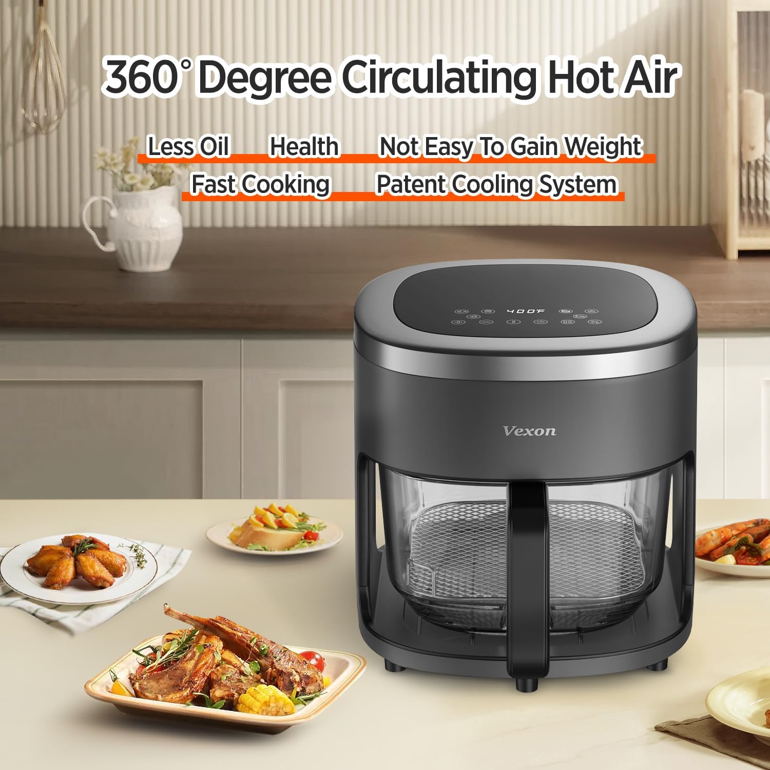 6-IN-1 Glass Air Fryer,4.5QT Air Fryer with Viewing Glass Pot, Air Fry, Dehydrate, Air Crisp Technology,Nonstick & Dishwasher Safe Basket,97% Less Oil,Features Digital Timer (Gray)