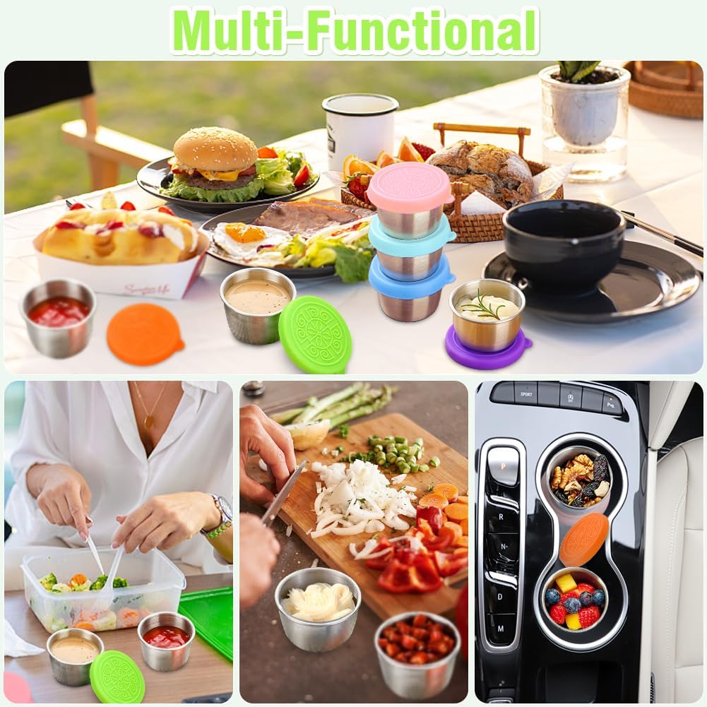 【Effortless Cleaning & Health Safety】 Dishwasher-safe construction (both silicone lids and steel cups) removes stubborn grease instantly, eliminating hand-washing hassles. Crafted with BPA-free for safe storage of sauces, snacks