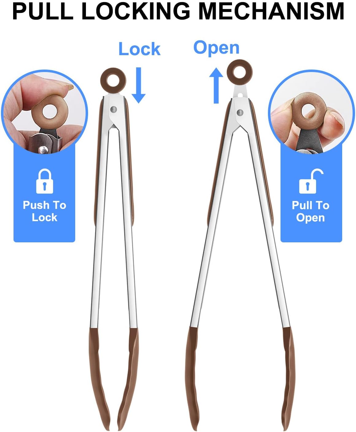 LOCKING MECHANISM & PULL-RING TECHNOLOGY : Our pull ring technology will keep the food tongs from opening and closing accidentally which will allow you to facilitate better control while using them, simply pull the ring to lock and push to unlock. You can hang it on the wall also with the ring after using, or pull the ring to lock it and store in the drawer to save space.