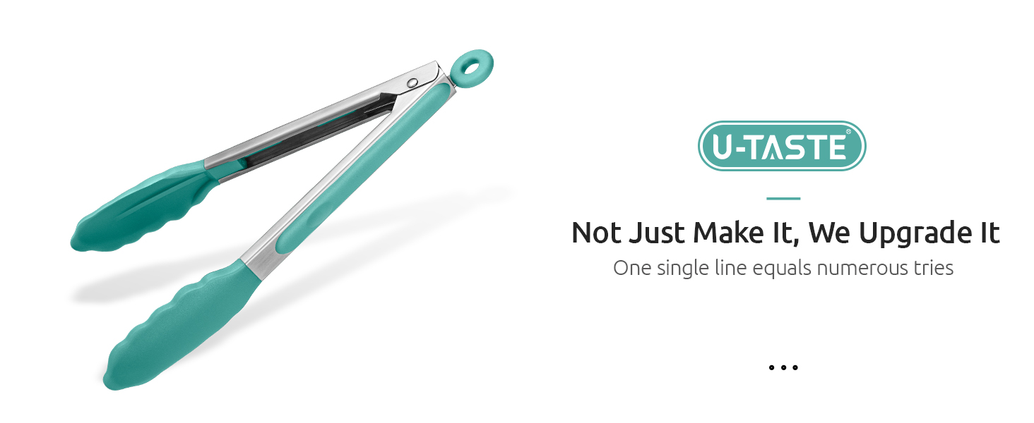 [18/8 Stainless Steel Handles & Food Grade Silicone] U-Taste kitchen cooking tong set is made of 18/8 stainless steel and food grade silicone. Upgraded 0.8mm thick stainless steel is sturdier and tougher compared to the original version (0.6mm thick). Capable to serve a large piece of food with no sign of shaking or bending. No more strong smell, risk of rusting, deformation or any other problems like chipping off. Handles coated with Food Grade silicone provide a comfortable and not slip grip.