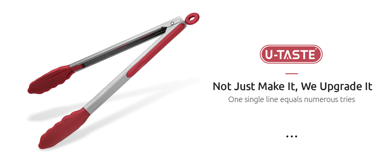 [18/8 Stainless Steel Handles & Food Grade Silicone] U-Taste kitchen cooking tong set is made of 18/8 stainless steel and food grade silicone. Upgraded 0.8mm thick stainless steel is sturdier and tougher compared to the original version (0.6mm thick). Capable to serve a large piece of food with no sign of shaking or bending. No more strong smell, risk of rusting, deformation or any other problems like chipping off. Handles coated with Food Grade silicone provide a comfortable and not slip grip.