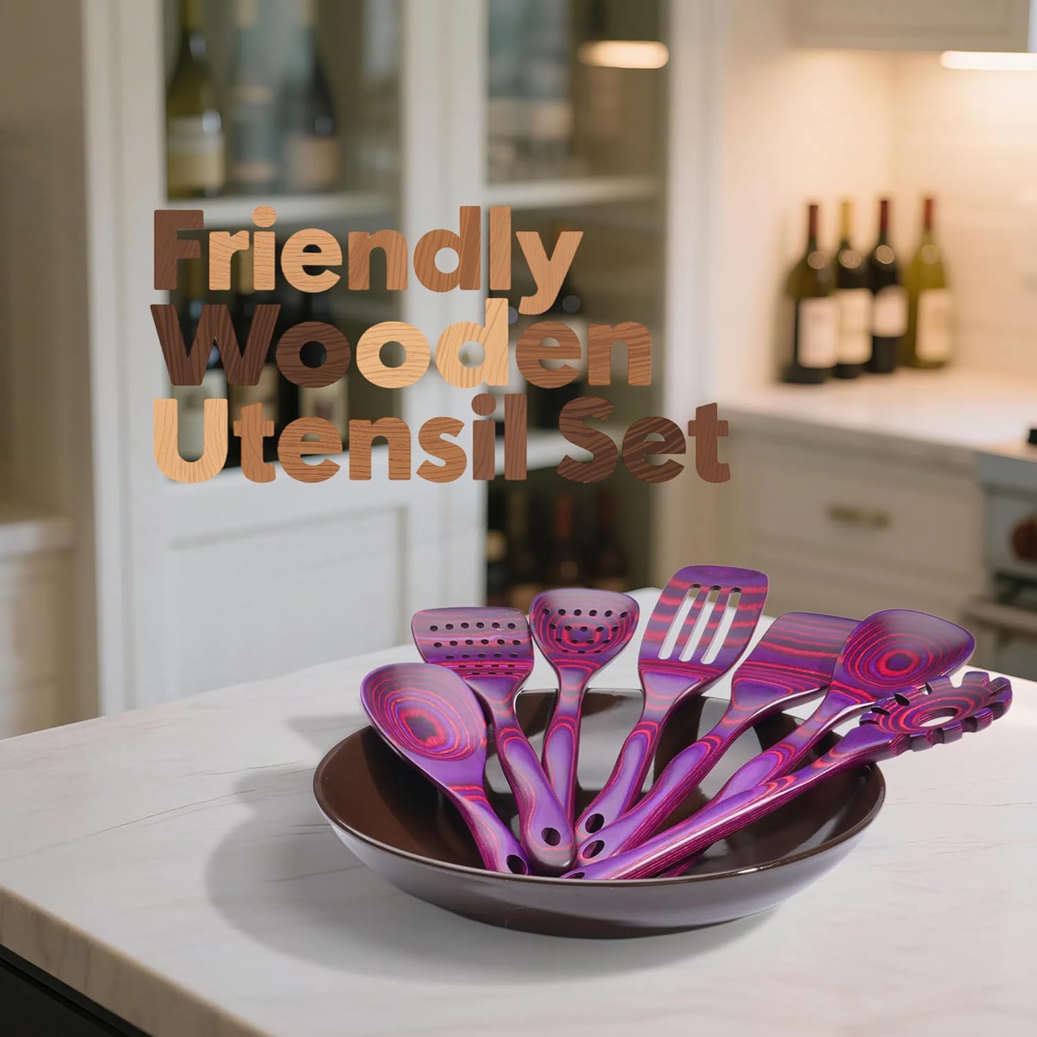 『Pakkawood Kitchen Utensils』This beautiful kitchen cooking utensil set with unique color is made of pakkawood. Pakkawood is crafted from many layers of hardwoods, infused with natural and chenical-free dyes. As is a pressure-treated, intensely heated material, it is resistant to heat, water, warp. It is a great choice whether for everyday use or speical occasion.