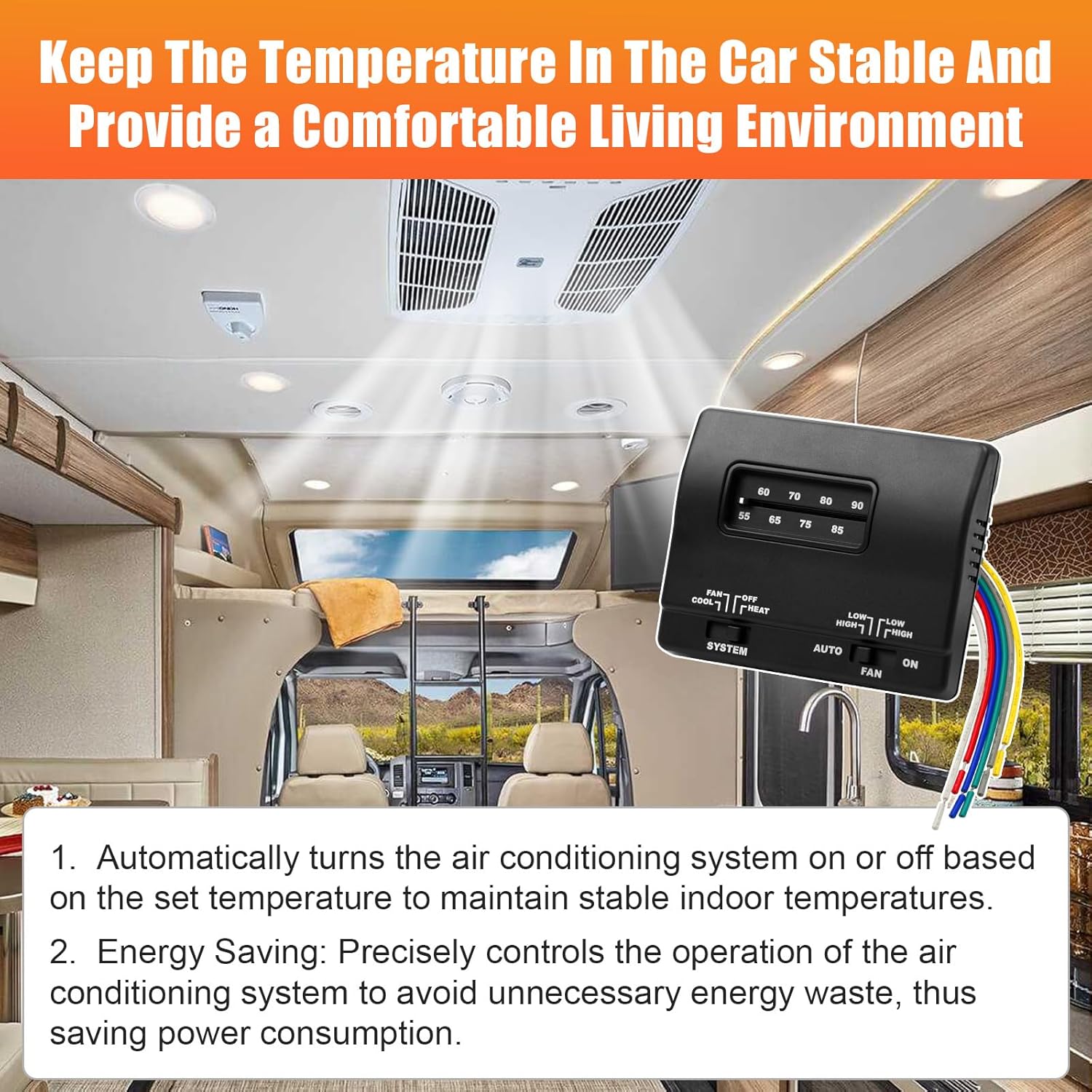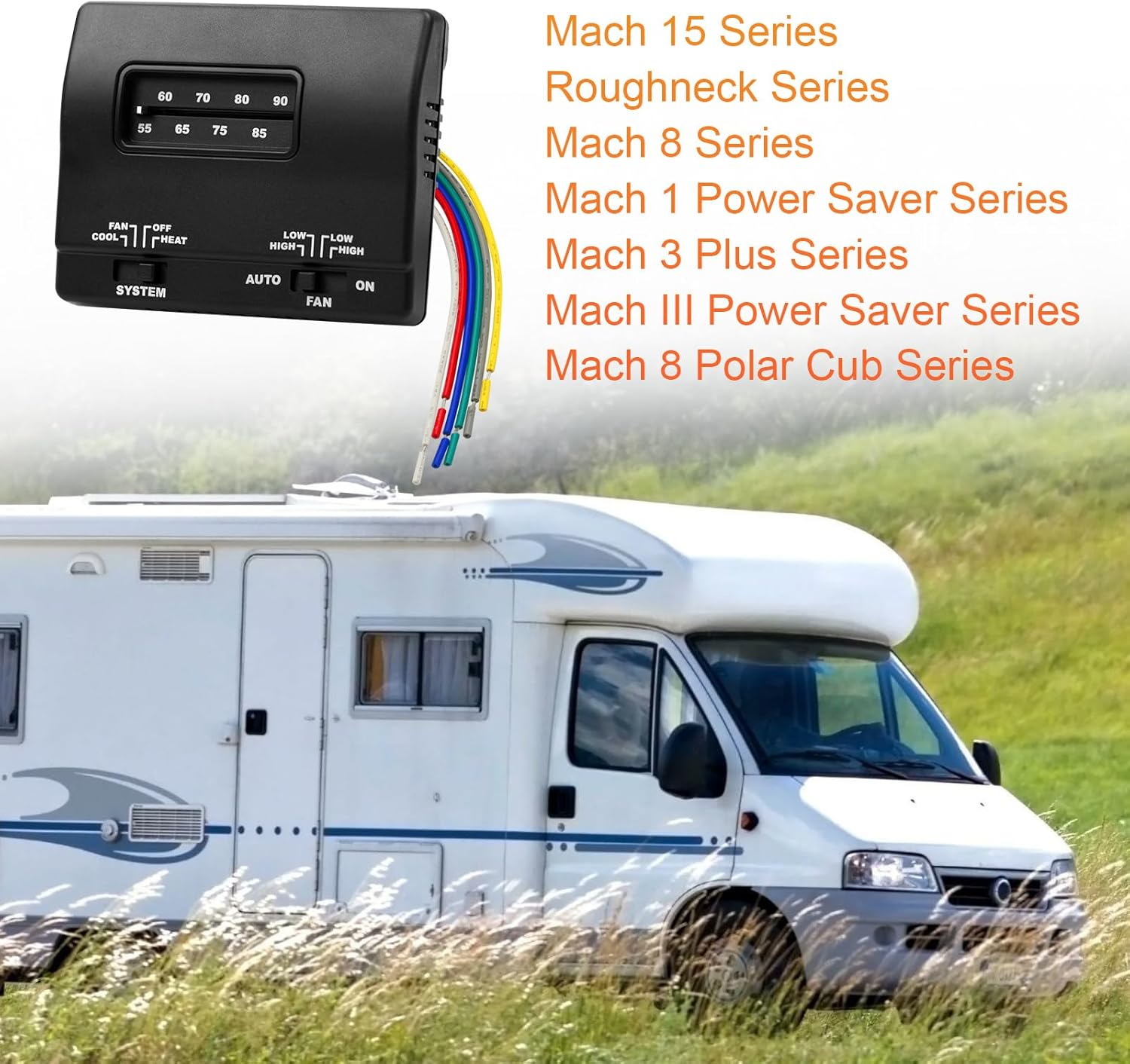 The Ihoumex RV Thermostat 7330F3852 is specifically designed for seamless integration with Coleman Mach RV air conditioners, ensuring perfect compatibility for a wide range of models. This thermostat provides precise 12V temperature control for both cooling and heating functions, including AC and heat strips, making it an ideal choice for maintaining comfort in your RV all year round.