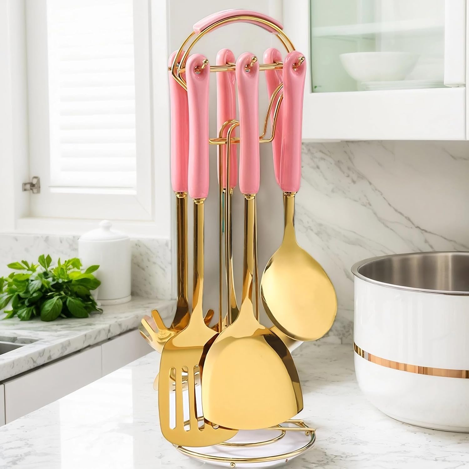 Versatile and Practical: This gold kitchen utensils set includes all the essential tools for cooking, from stirring to serving. The stainless steel cooking utensils set is perfect for both daily meals and special occasions, with a sleek pink and gold design.