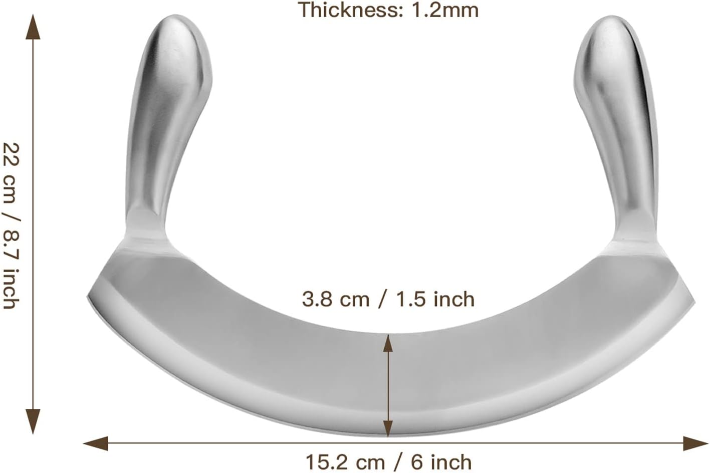 Mezzaluna Knife Size: 22X3.8X15.2CM / 8.7X1.5X6 Inch, Thickness: 1.2mm.Weight about 150g/0.33 lbs