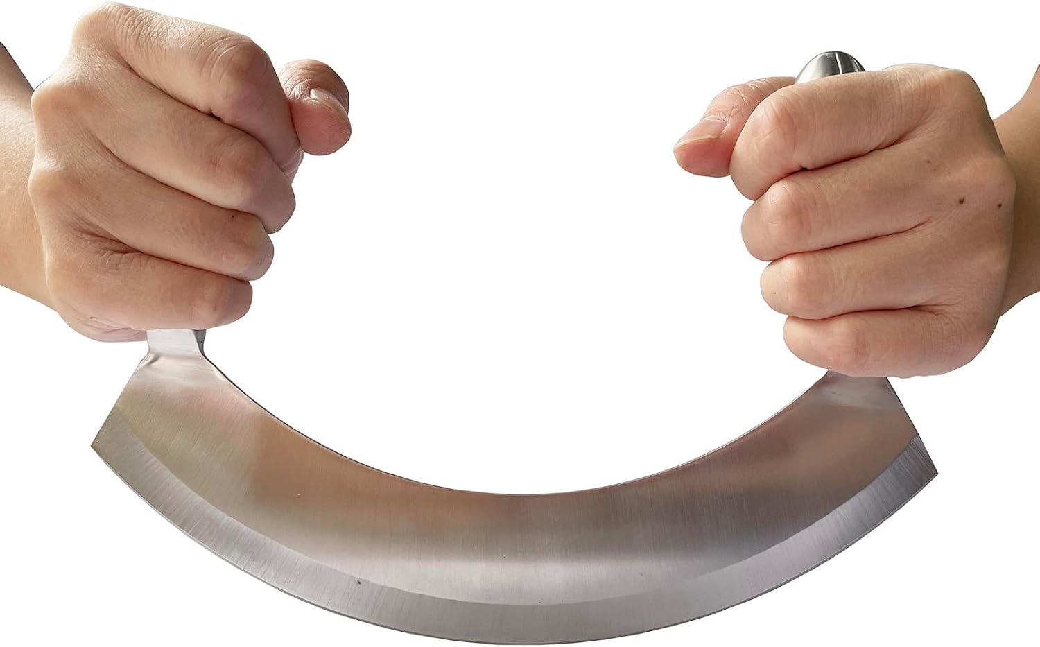 Mezzaluna Knife made of 430 stainless steel,high hardness, strong and not easy to rust.Ergonomic handles keep hands and knuckles at a safe distance from the blade.