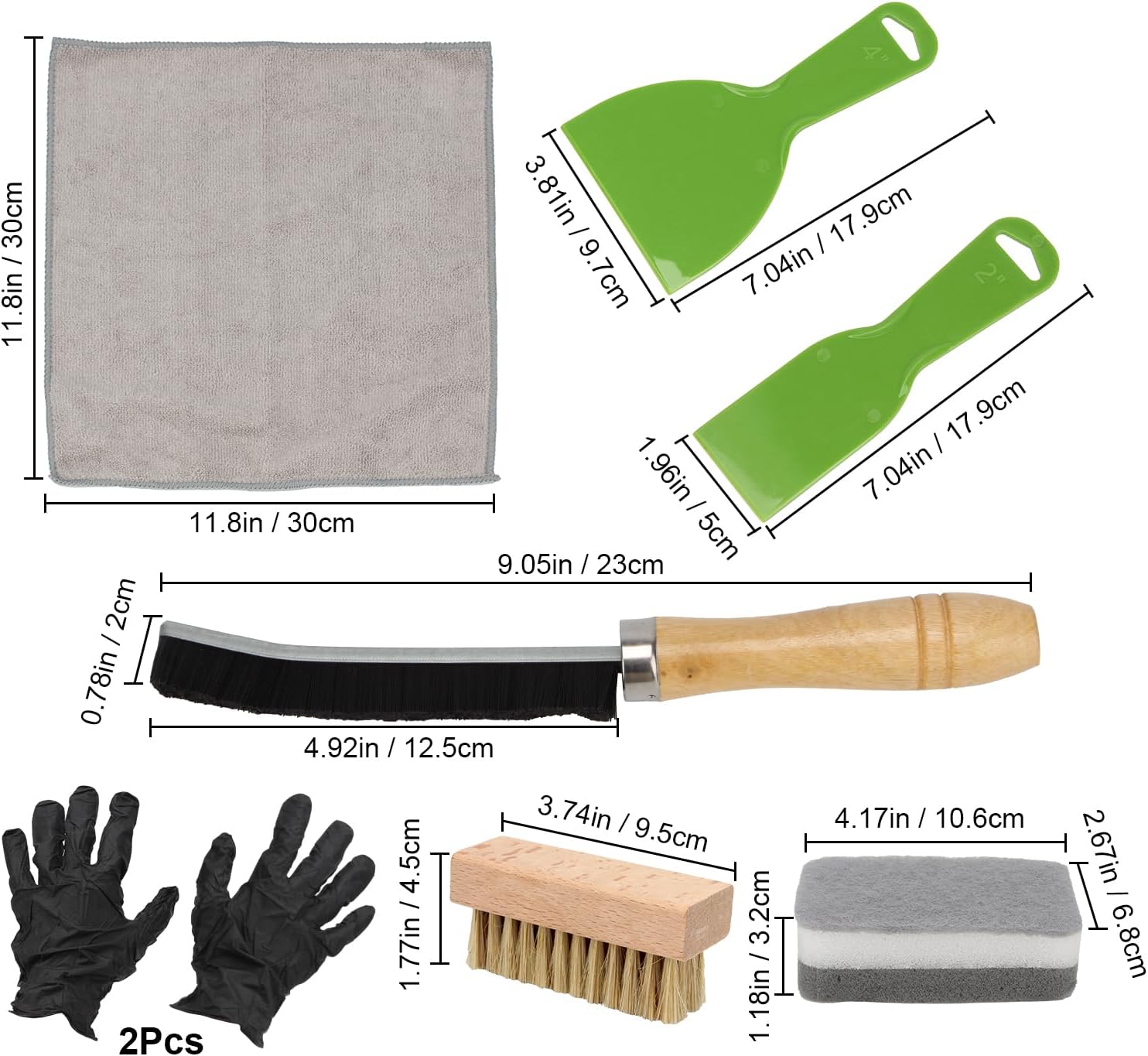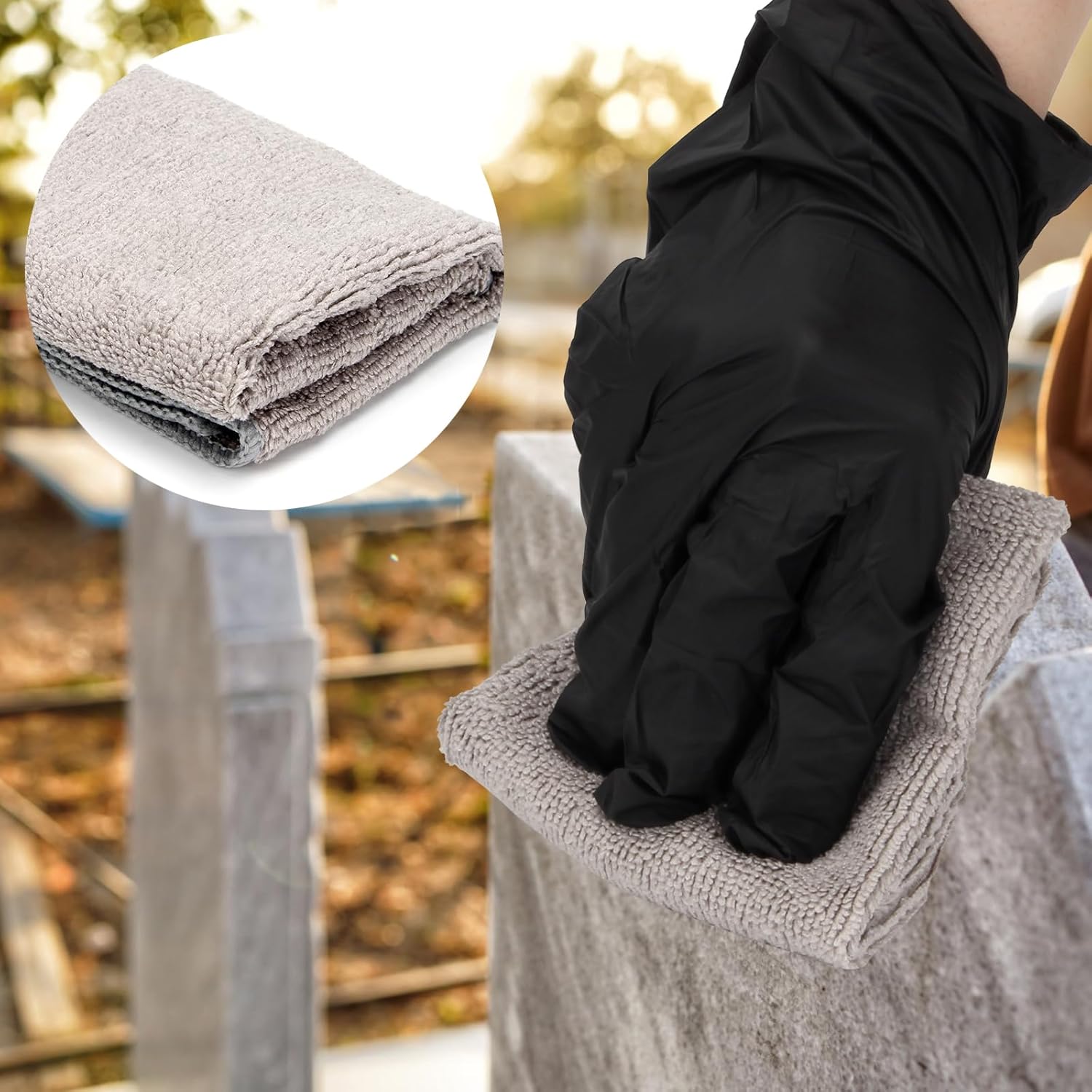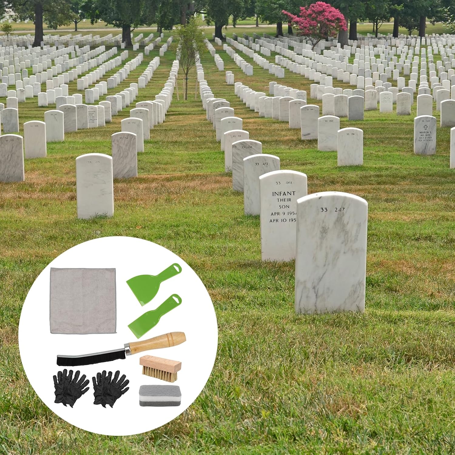 Complete Cleaning Set: The headstone cleaner kit Includes 8 essential tools, Featuring 1 gray microfiber cloth, 1 bristle crevice cleaning brush, 1 scrub brush, 2 pairs of black disposable gloves, and 1 headstone cleaning sponge, and 2 green plastic scraper.