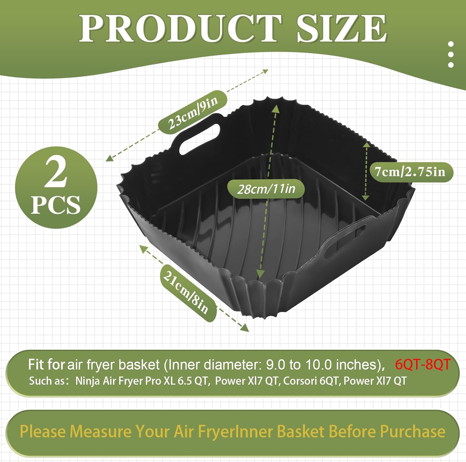 9 inch Silicone Air Fryer Liners Square for Cosori 6QT/Ninja Air Fryer Pro XL 6.5QT, 2PCS Non-Stick Reusable Fryer Accessories for 6-9 Qt Frying Basket